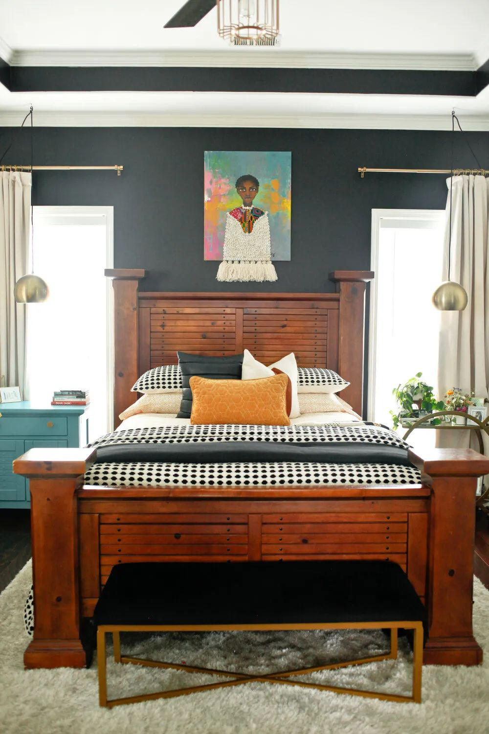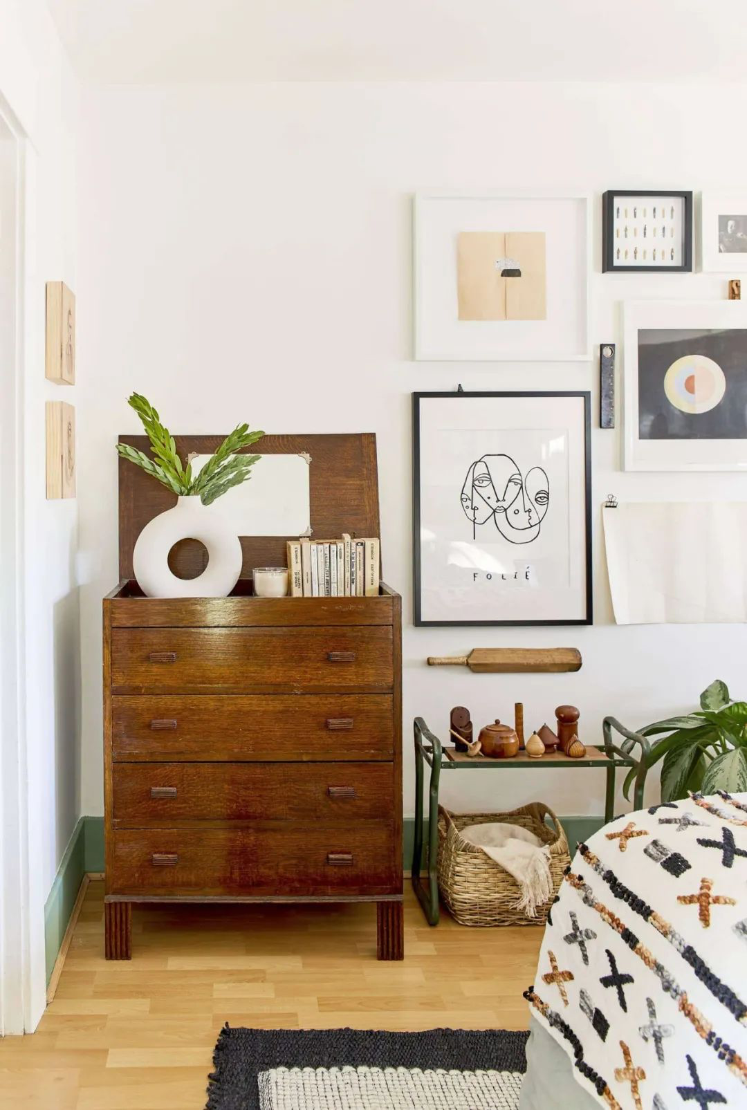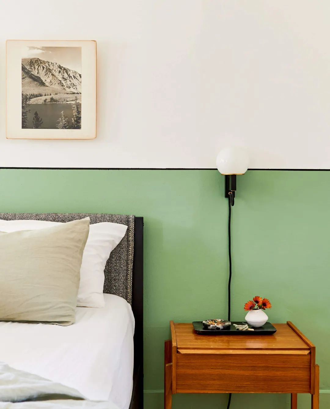床头位置的墙面颜色可以调整入睡时的心情,我们可以用健康油漆为自己DIY 一小片墙面色彩领域来衬托床头。设计师Julie Rose用绿色油漆粉刷了一间卧室墙壁的下半部分,她创造出一种连接床头板的错觉。绿色和白色墙壁之间的黑色细线有助于划分房间,这是一种低成本的卧室改造。