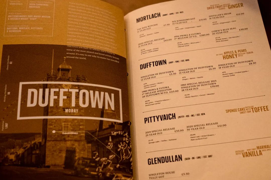 威士忌酒单厚厚的一本,按产区划分,但是对每个产区的介绍都精确到酒厂所在的小镇或是区域。
