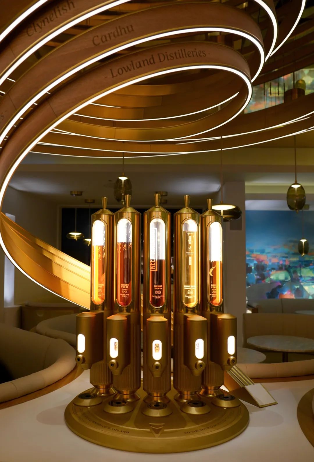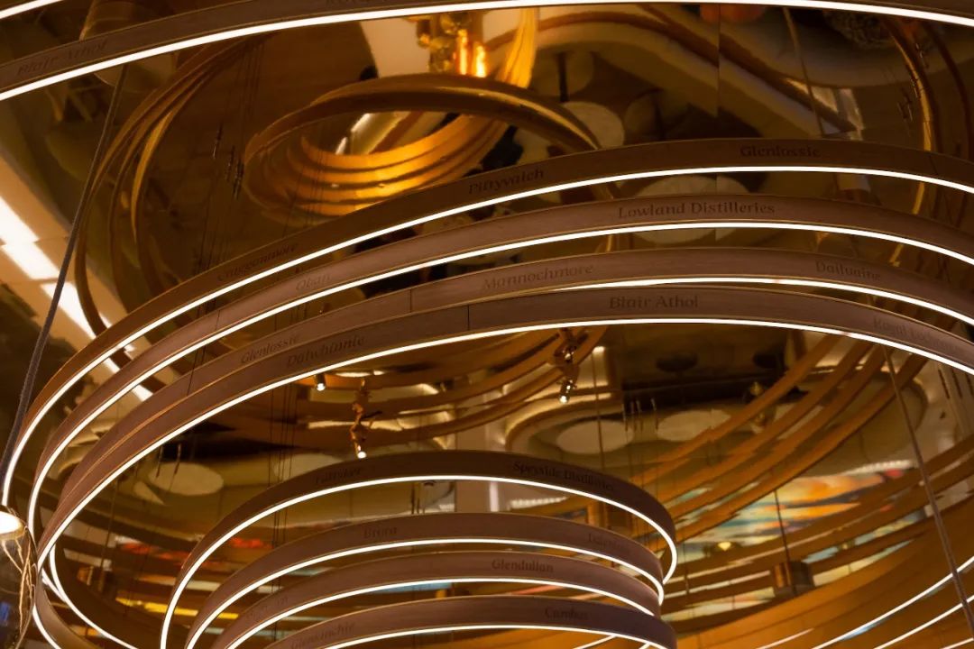 从楼顶垂下的螺旋状装饰,像是被拆解的橡木桶,又仿佛寓示时间的流逝。木片上写满了帝亚吉欧各个酒厂的名字,终点的五只容器分别装着来自四家不同酒厂的单桶以及一只专供的尊尼获加调和。