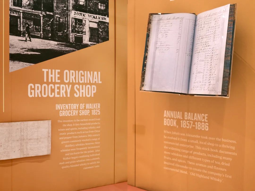 200年历史的长廊中,不仅能看到尊尼获加小杂货店时期的手写账本(也是威士忌最早的进销存记录),也展出了其代表性的瓶型和icon的起源。