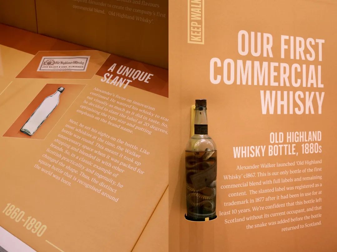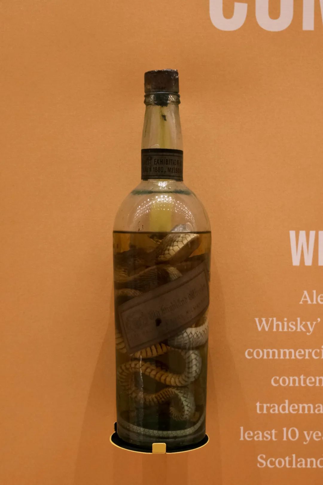 其中有条蛇的这瓶,是1867年,尊尼获加发布的品牌为“Old Highland Whisky”的第一批商业售卖的调和威士忌中,还保留完整酒标的唯一一瓶。