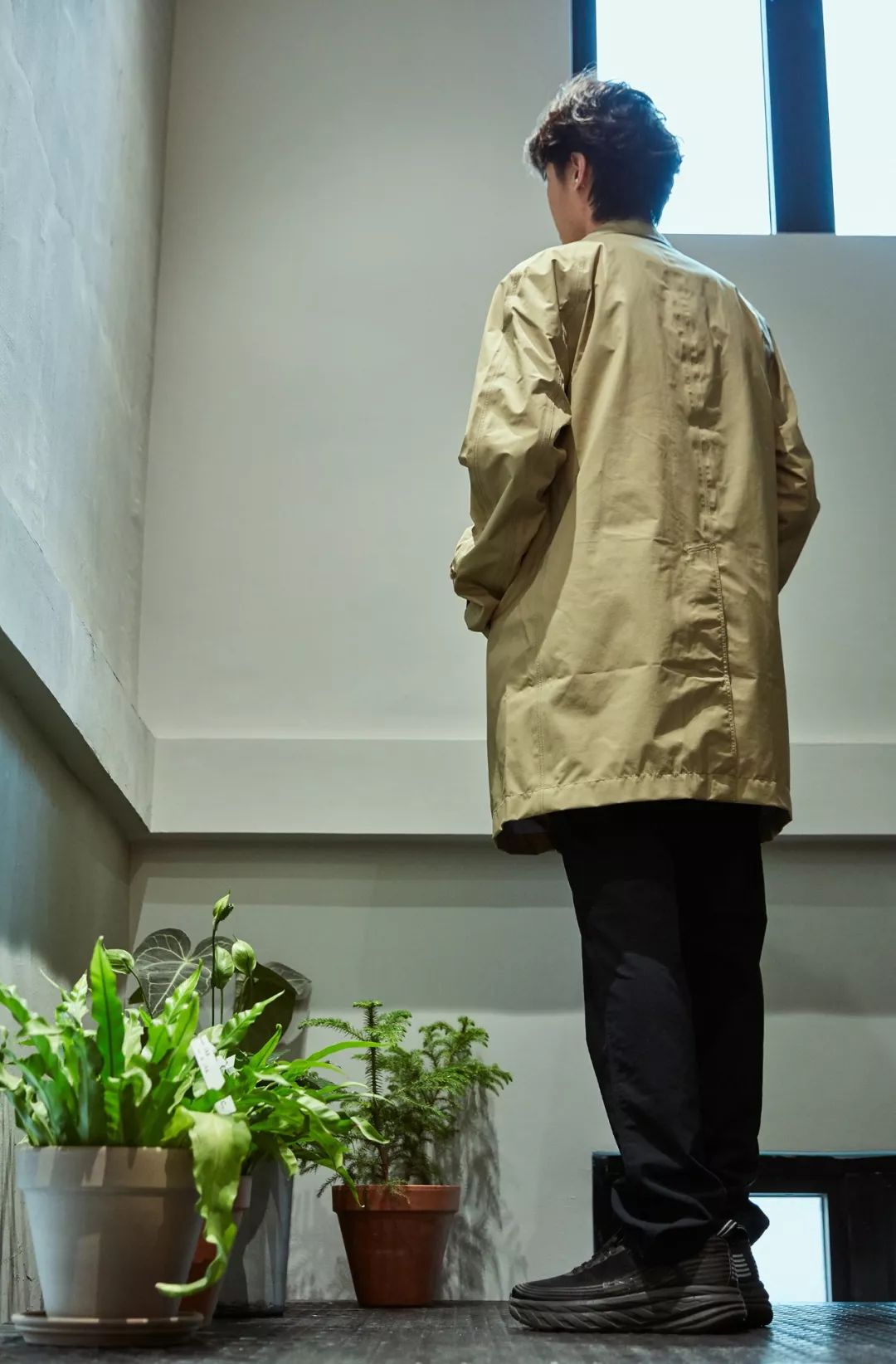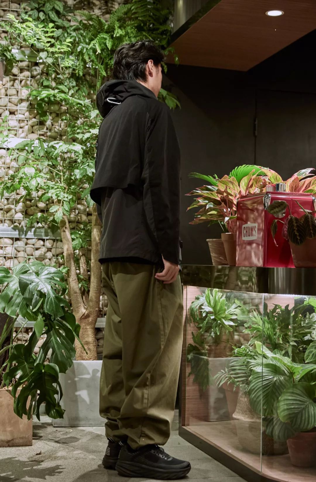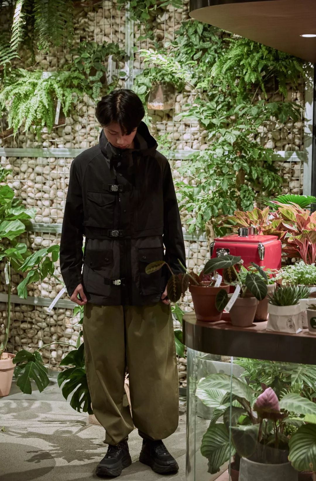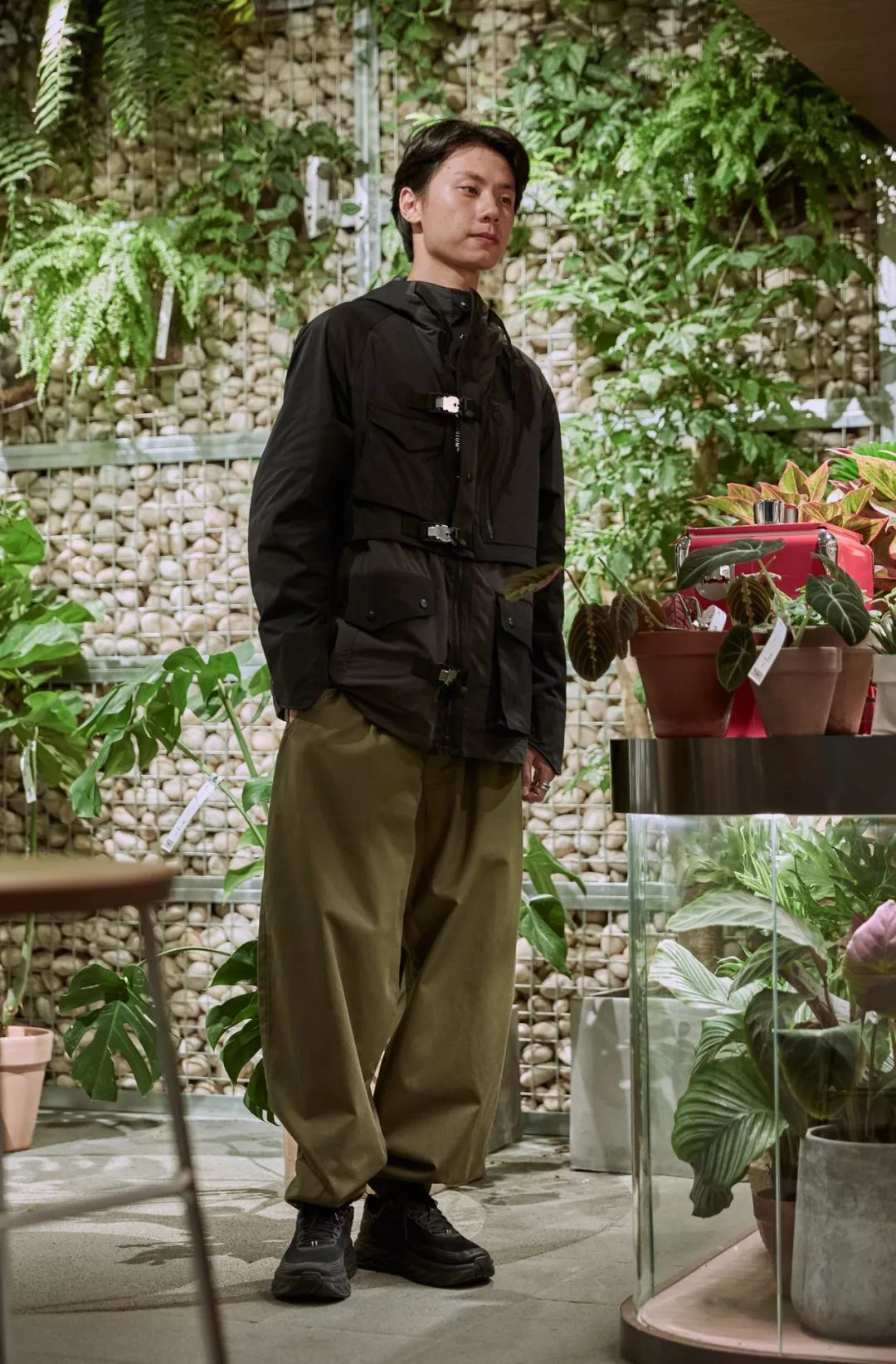 White mountaineering 军事防水冲锋衣,熟悉白山的朋友都知道,作为一个处在街头时装与时尚潮流中间的品牌,其出众的剪裁及配色上的设计在户外品牌中一定是佼佼者,其次 CAL O Line 的收口阔腿裤在整体搭配中更是吸睛的一笔,廓版的设计,裤脚的推挤感,更是增加了整体搭配层次。