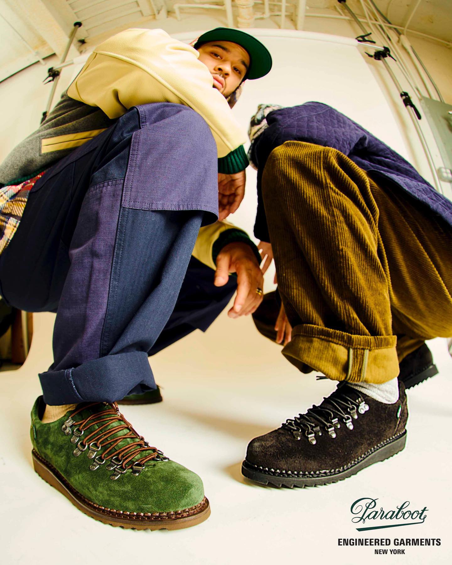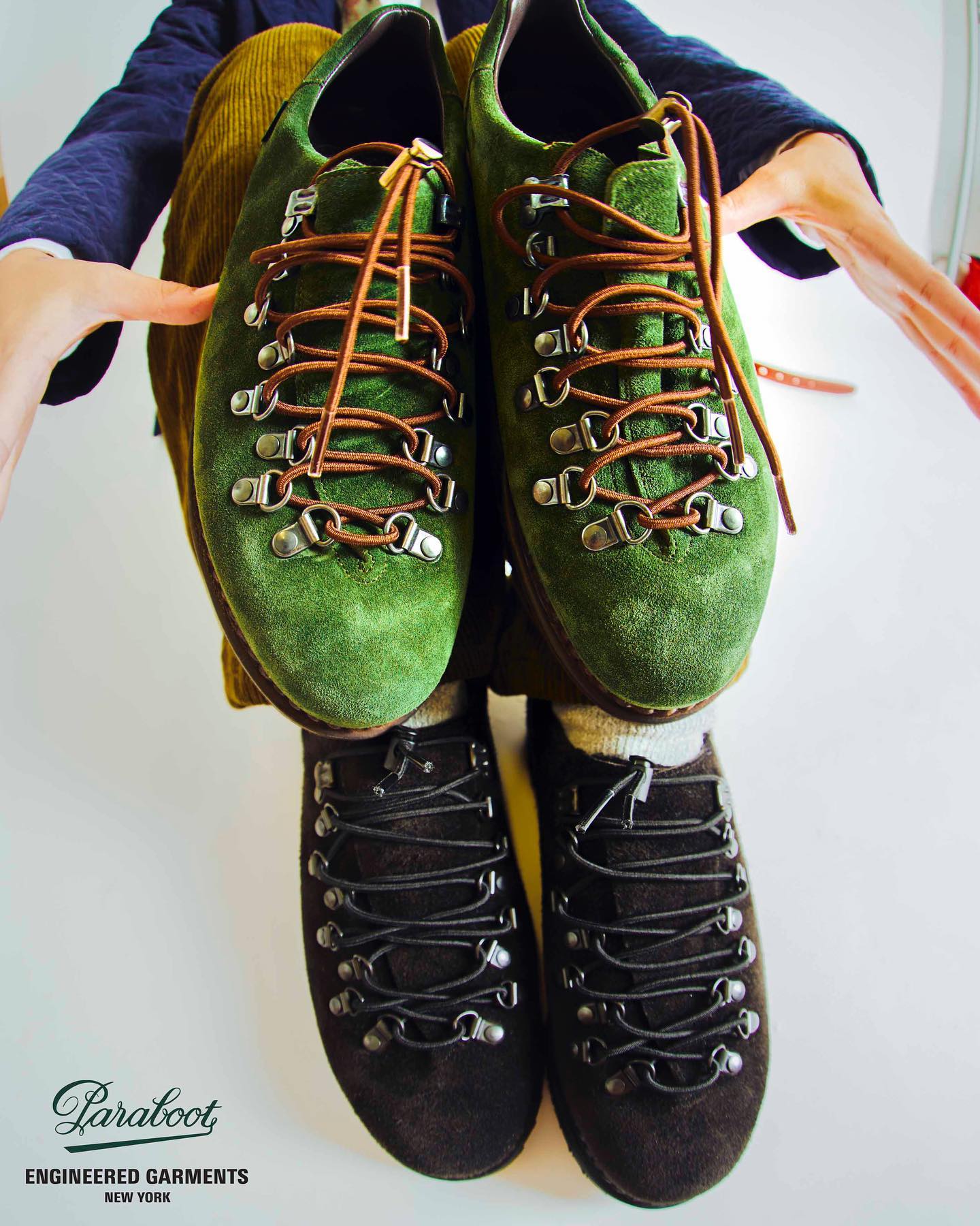 Clusaz 鞋款最初灵感来自 Paraboot 60 年代和 80 年代的登山靴,随后 Paraboot 将鞋款以低帮版本重新演绎,融入都市风格。而这次 Engineered Garments 则是将 Clusaz 再度升级,以细腻的麂皮材质代替传统的光面皮革,,同时绿色与棕色的鞋面配色,也让鞋款活力满满。