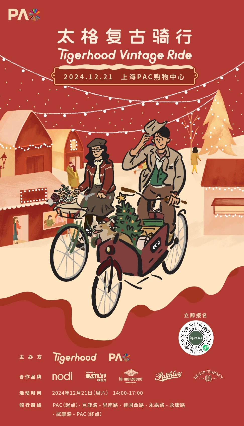 整场「PAC x 太格复古骑行」活动,将于12月21日14:00开始,并以 PAC 为起点进行骑行,沿途会经过:巨鹿路-思南路-建国西路-永嘉路-永康路-武康路,最终回到 PAC,在「自在市集」中去沉浸式感受一场浪漫且温暖的北欧之旅,并将这种美好体验继续漂流下去。