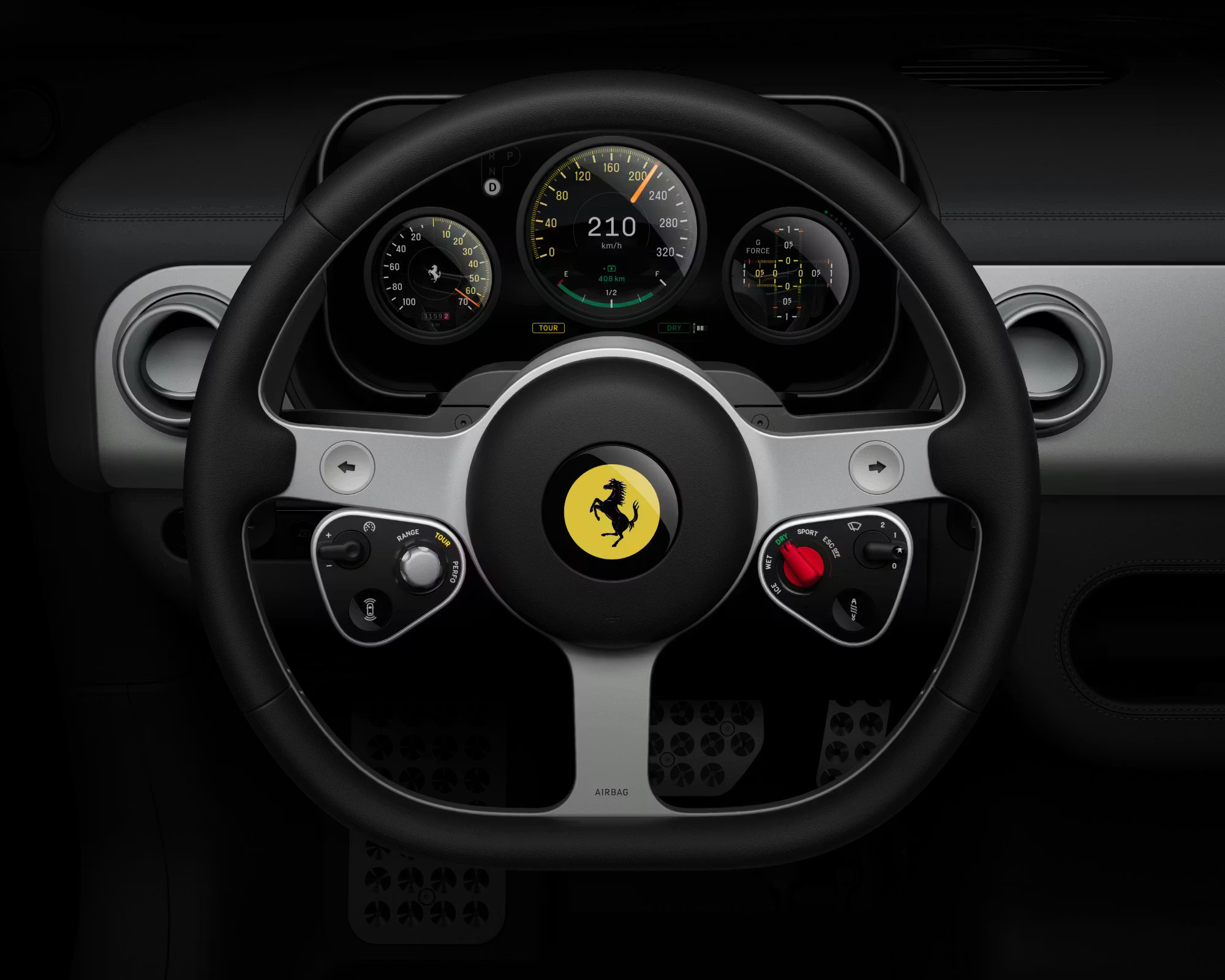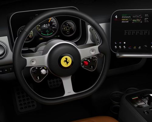Ferrari Luce 的界面虽然也包含数字显示屏,例如简洁的控制面板,但其主要亮点在于机械按钮、旋钮和开关。控制面板下方有九个旋钮,主要用于控制空调;而右上角则集成了一项精湛的制表工艺,通过独立电机在时钟、计时器、指南针和弹射起步功能之间自由切换。在大多数现代汽车中,这些功能都已实现数字化。Luce 的方向盘采用特制超薄铝合金打造,配备种类丰富的实体按键,以及两个灵感源自法拉利一级方程式赛车的模拟控制模块。根据法拉利的官方新闻稿,这些触感舒适的传统设计元素旨在营造“简洁”、“熟悉”且“易于操控”的驾驶体验。简而言之,两位未来主义设计先驱 Jony Ive 和 Marc Newson ——决定回归经典。据悉,Luce 的完整外观设计要到五月才会揭晓,让我们拭目以待。