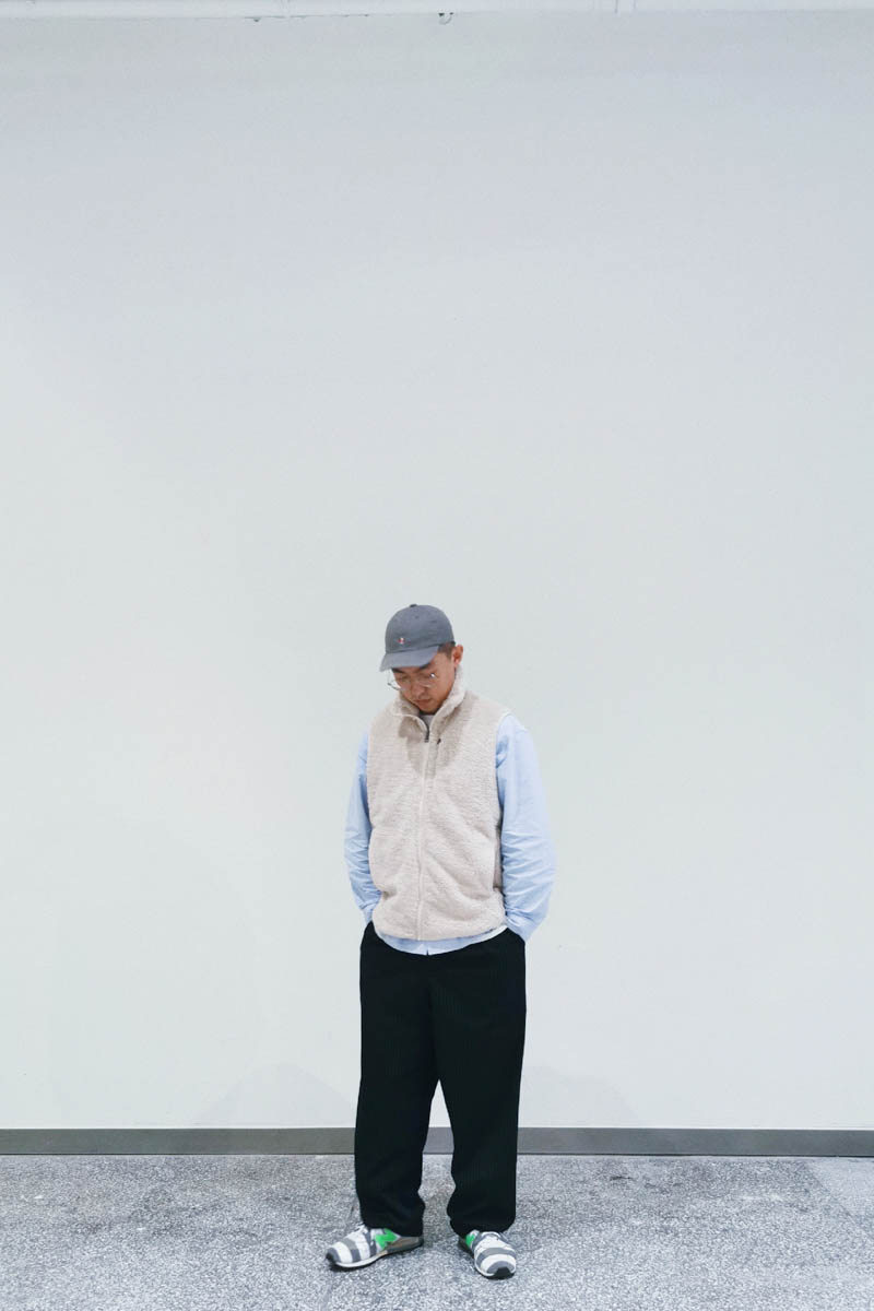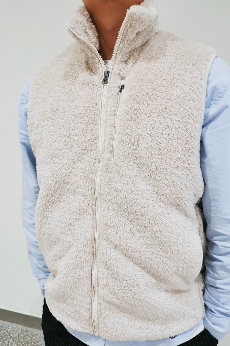 Dean Zhao:上身这件是UNIQLO今年秋冬的长绒摇粒绒马甲。推荐它,是因为看似基础的款式一样可以搭出质感,加上性价比是真的高。今年出差比较多,经常北方南方来回飞,这件马甲比较容易携带。如果落地之后温差比较大,我就会从包里拿出来暂时抵御一下风寒。和休闲一点的衬衫西裤搭配还多了些可爱的感觉。