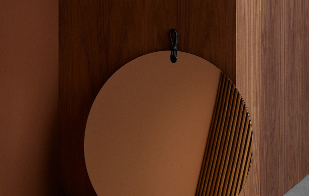 Kimi 是一款极简的镜子,厚实的木制背板,利落的侧边和富有质感的皮革挂带,细节之处彰显品质。
