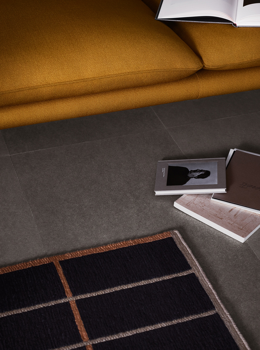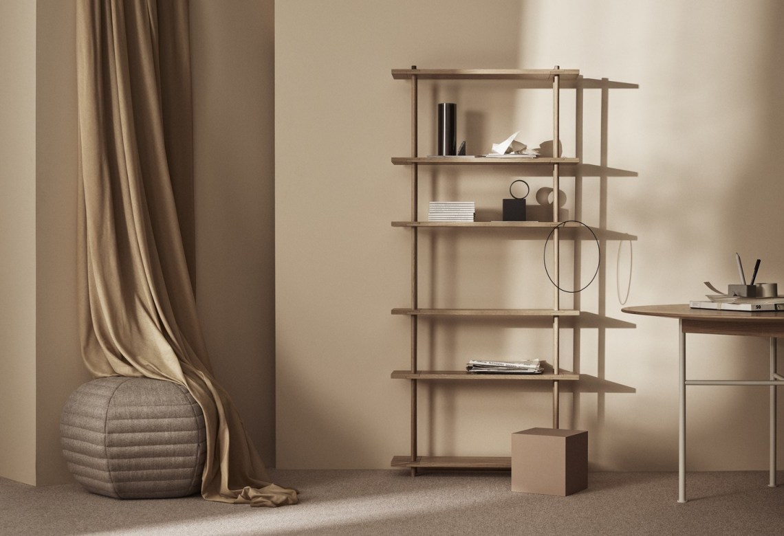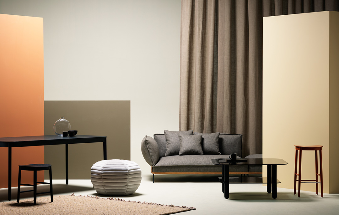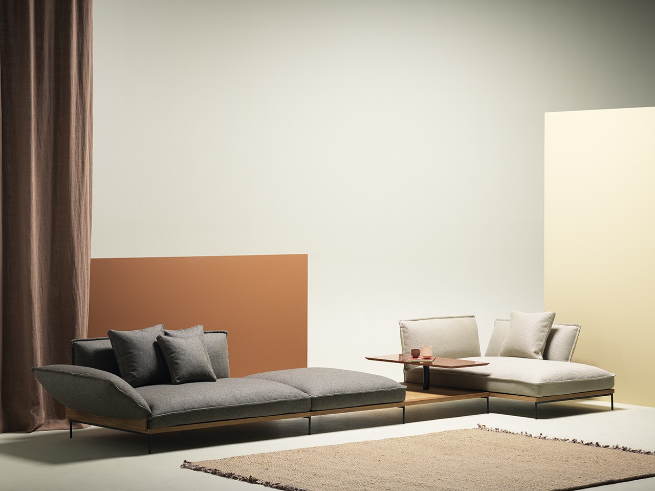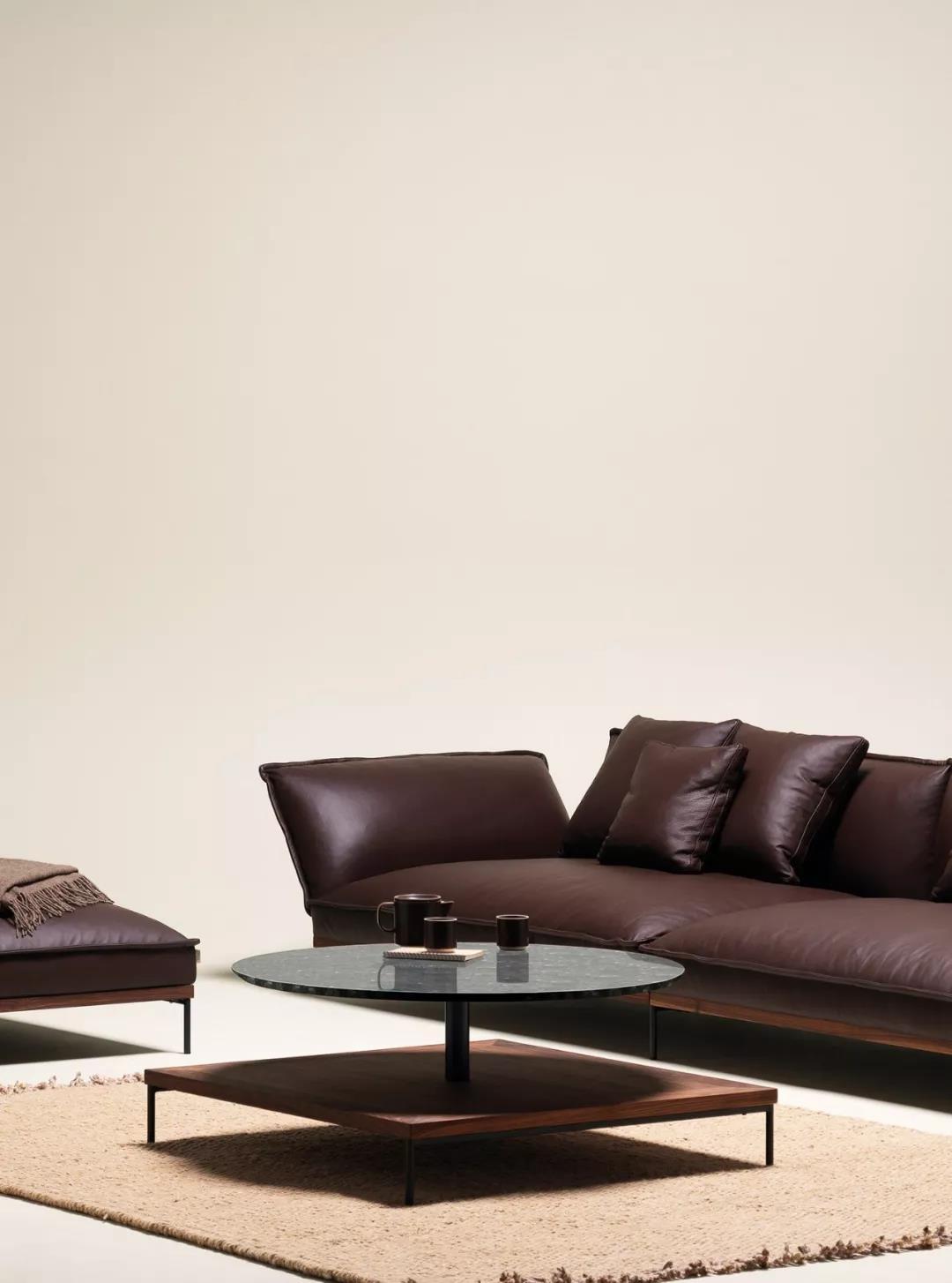Jord 沙发更加奢华一些,框架由金属和木材组成。背垫采用聚氨酯和棉絮,非常柔软。模块化的拼接方便空出位置,担当茶几的作用。