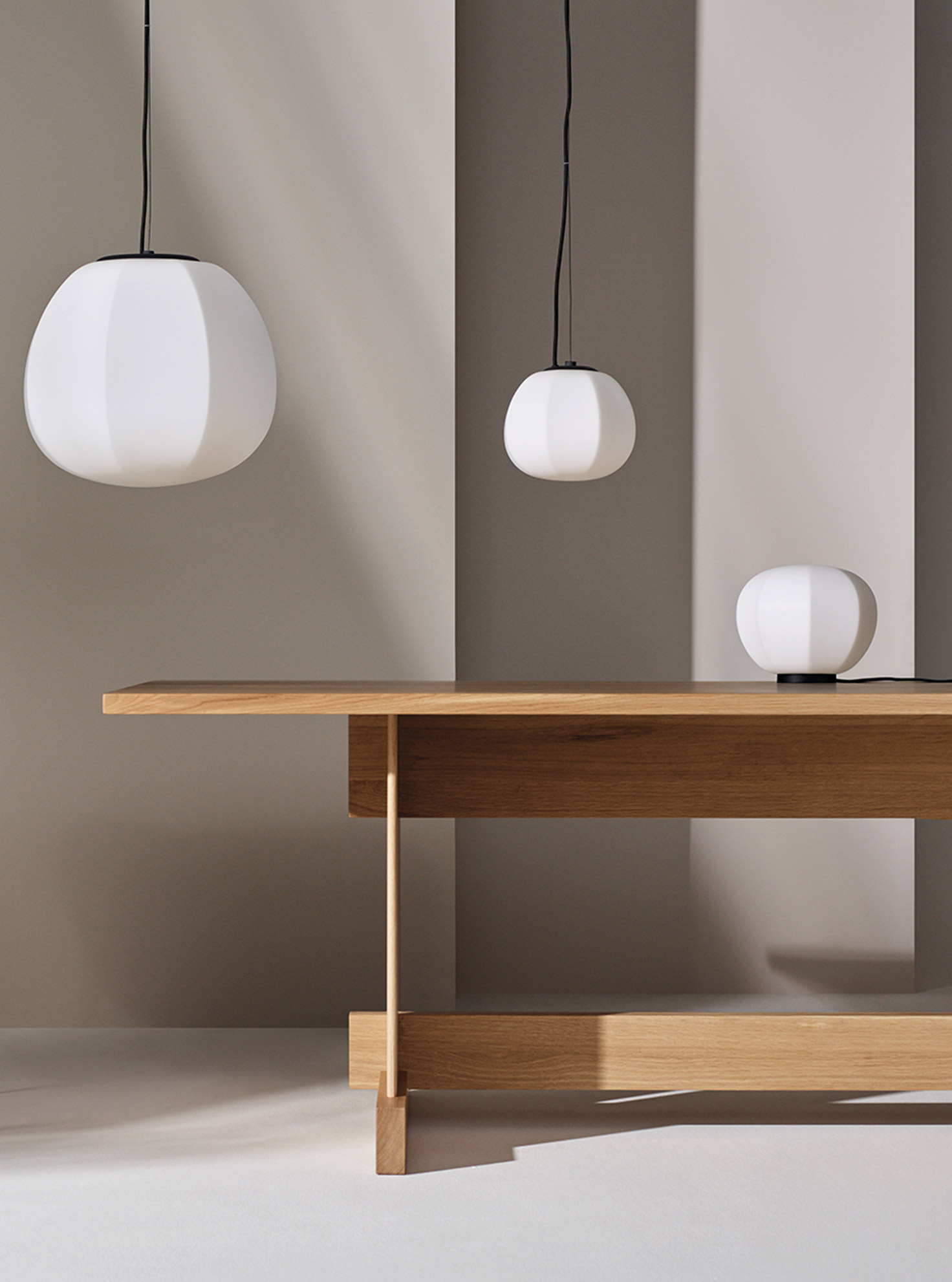 Persimon 是 Fogia 首次涉足照明领域。包含台灯和吊灯两种形式。优雅的乳白色的玻璃外观,散发出均匀柔和的光芒,不会过于刺激。