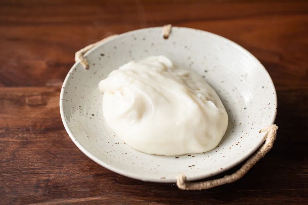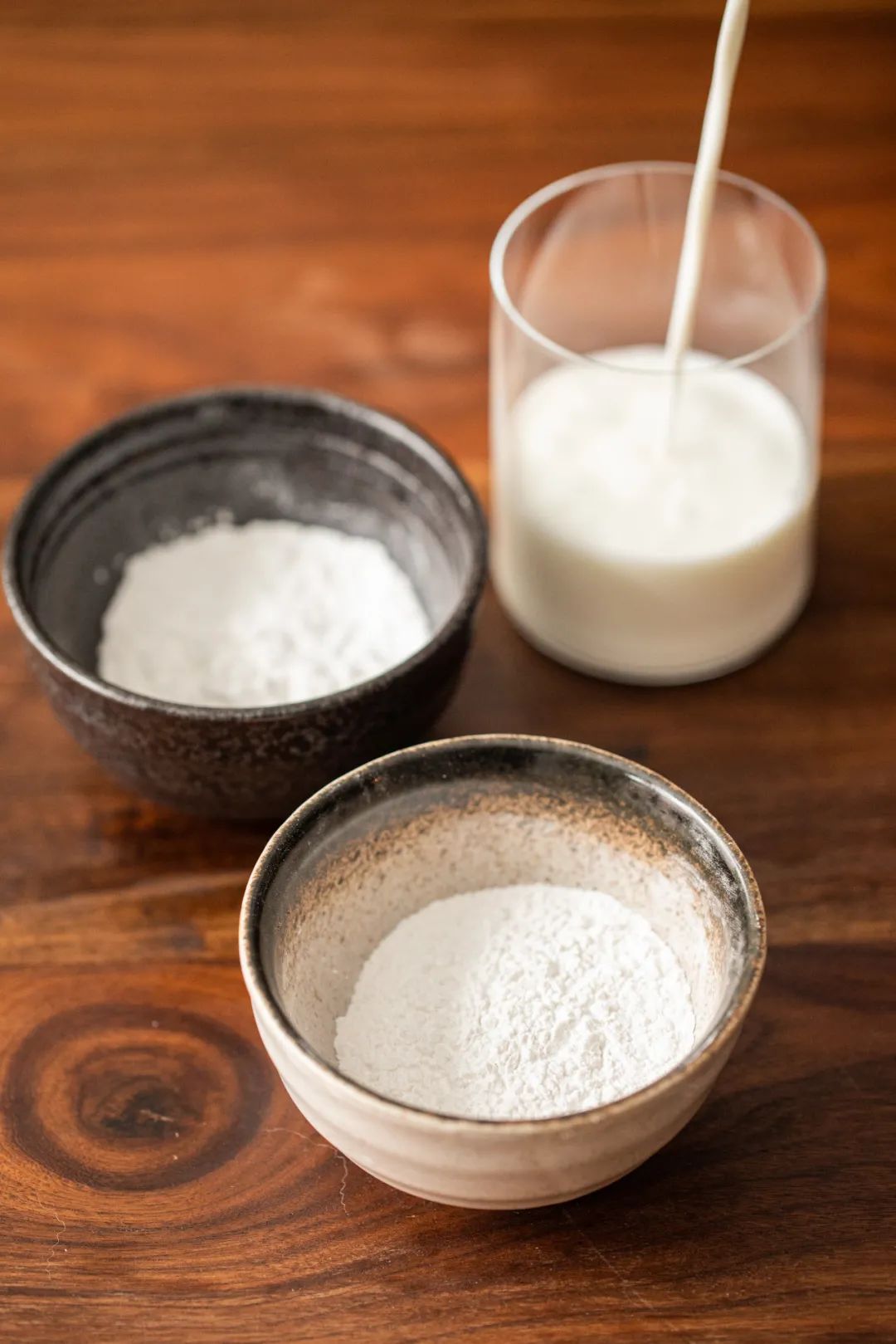 20g木薯淀粉、25g糯米粉、200g牛奶,混合均匀后在锅中小火煮成糊状,倒出来就是糯糯叽还能拉丝的年糕,也像云南的甜品米布。