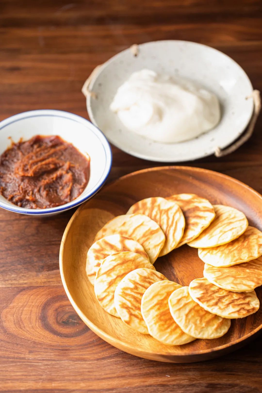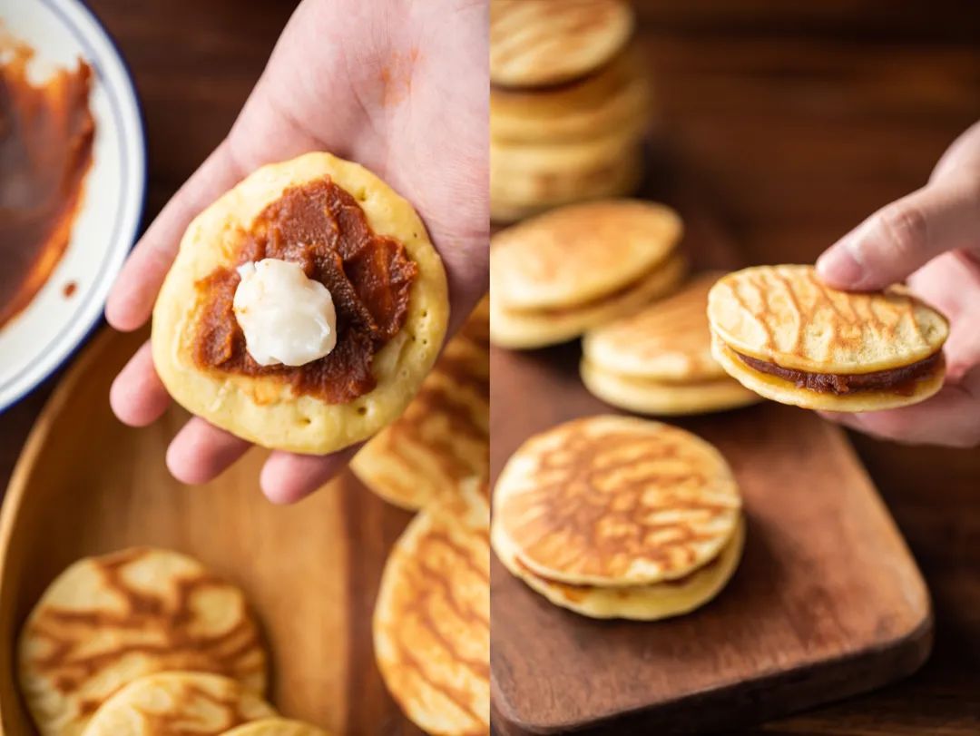 抹上红豆泥,中心加一小块年糕,两块饼这么一夹——