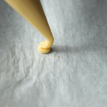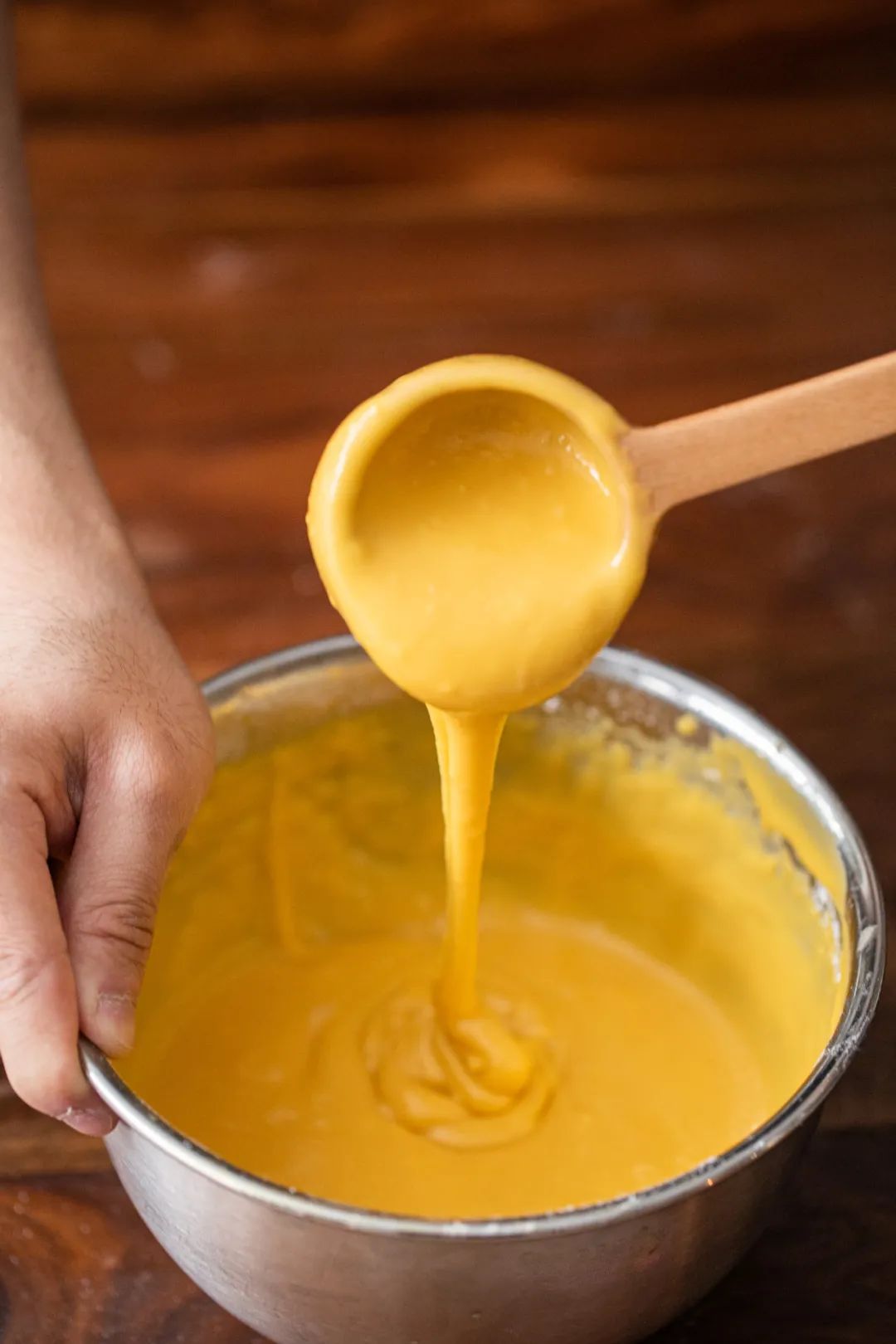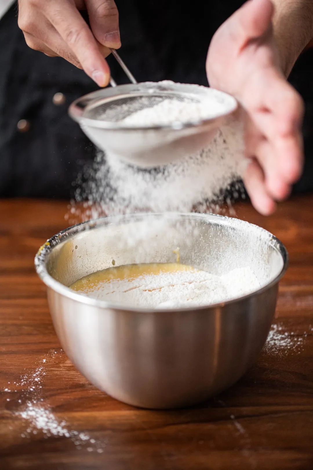 200g面粉加4g泡打粉,筛入上一步做好的蛋液中,混合均匀至光滑无粉状颗粒。