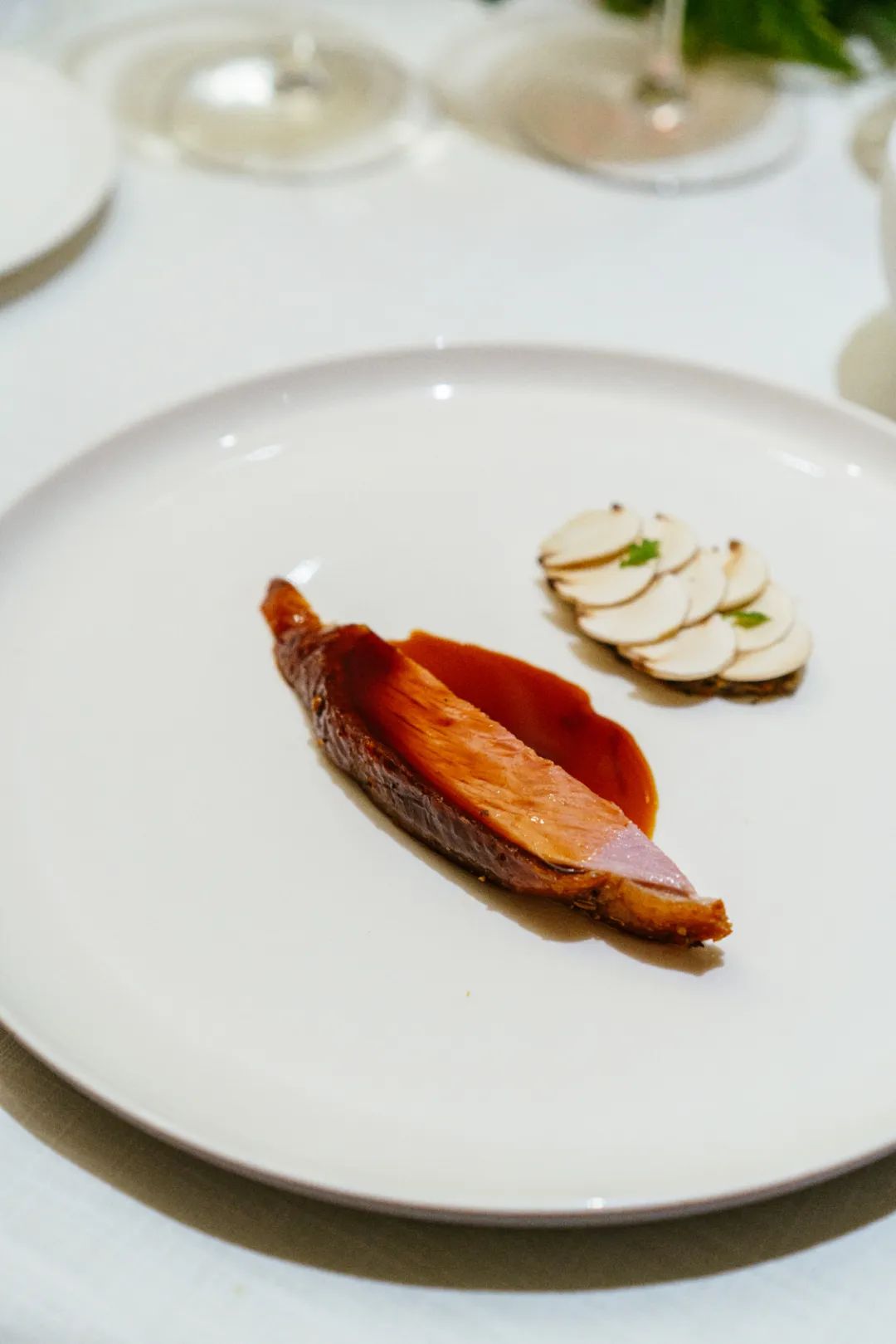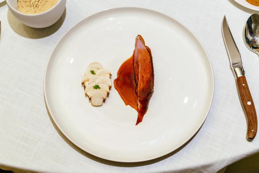 鸭子烤得太漂亮了,鸭皮酥化的程度,入口的油脂香气,完全是北京烤鸭的水平,鸭肉又保持了西餐里追求的精准五分熟。有道是——