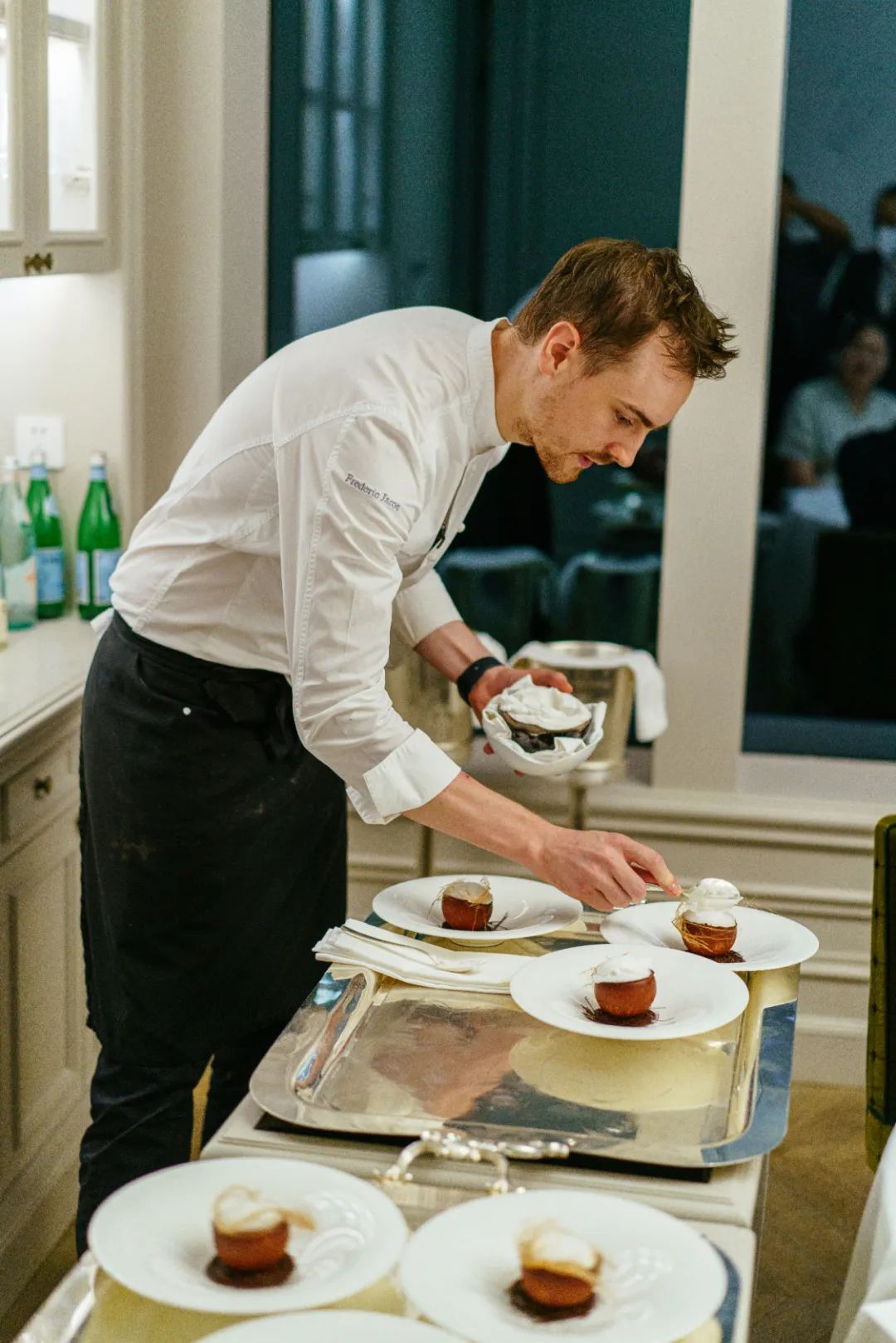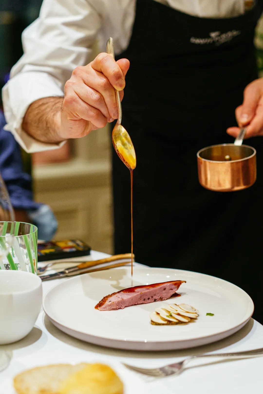 主厨为这道菜专门置办了一个烤炉,用挂炉的方式做烤鸭,先端出来给客人瞻仰一番,然后回厨房摆盘。