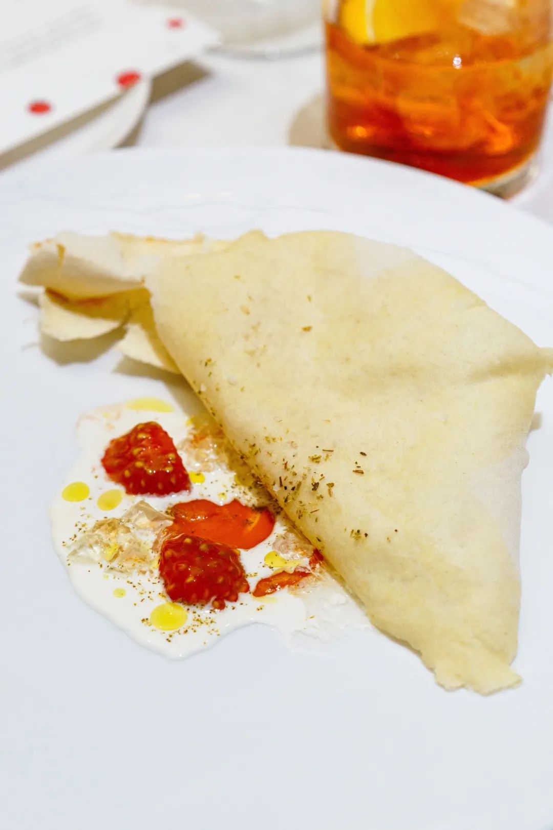 配了面包圈和开胃酒的“意式橄榄”,冷热与冰凉交叠的“海胆炸玉米”,还有金枪鱼塔塔配白茄子,这个菜去年夏天推出就很喜欢,我愿称为“DV鱼香茄子“。