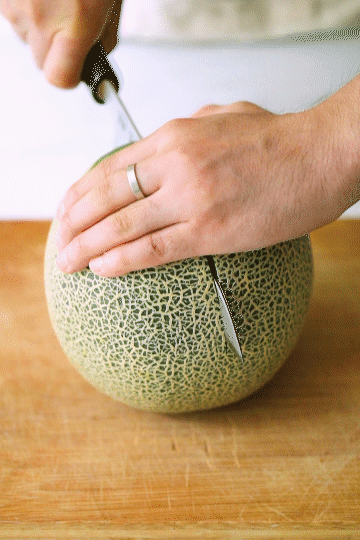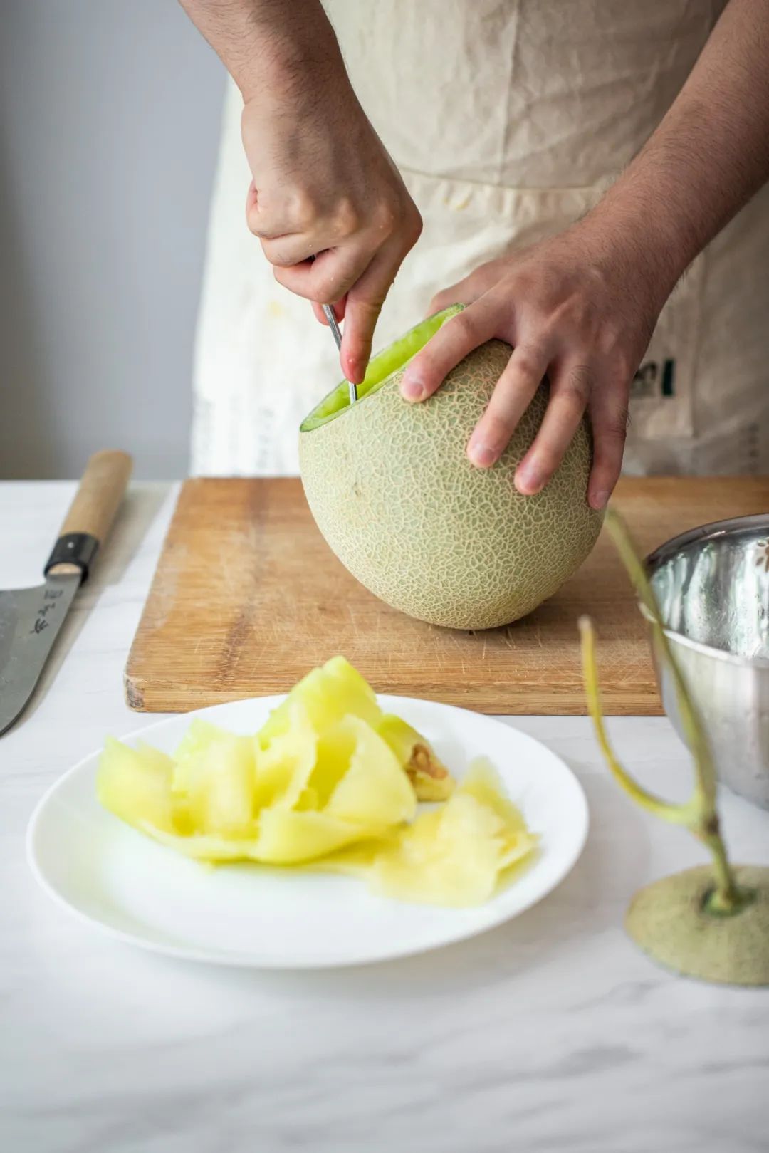 准备一颗蜜瓜,顶上开口,把果肉 kuai 出来,冷藏保存待用。