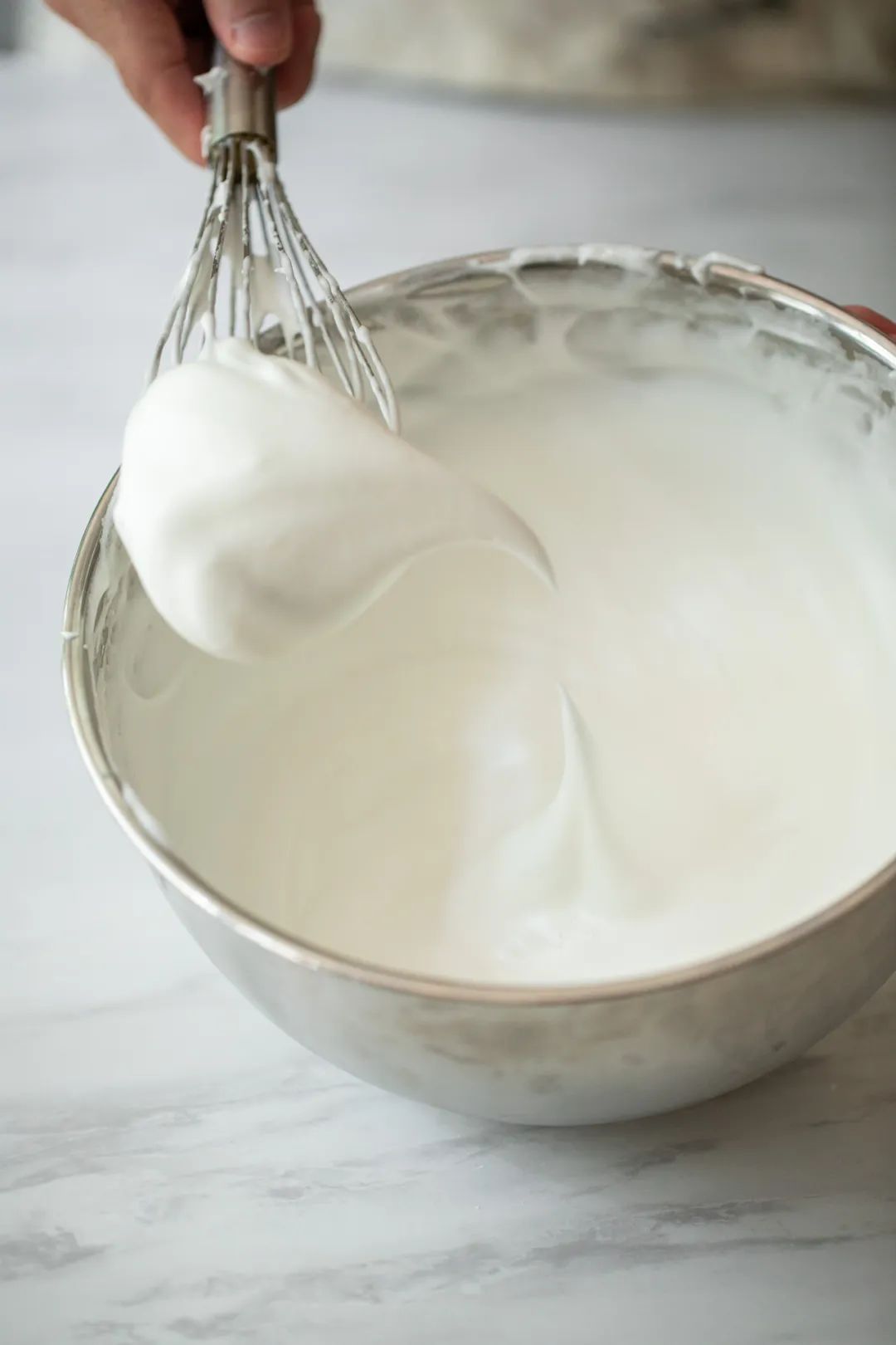 140g蛋清分三次打发,每次加入一点白砂糖,加一些打发一会儿,打到上面这种状态,蛋白霜洁白挺立,提起来有小尖钩。