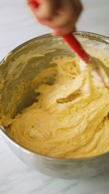 重新混合打发的蛋清和蛋黄,筛入90g面粉,搅拌均匀,蛋糕胚就做好了。