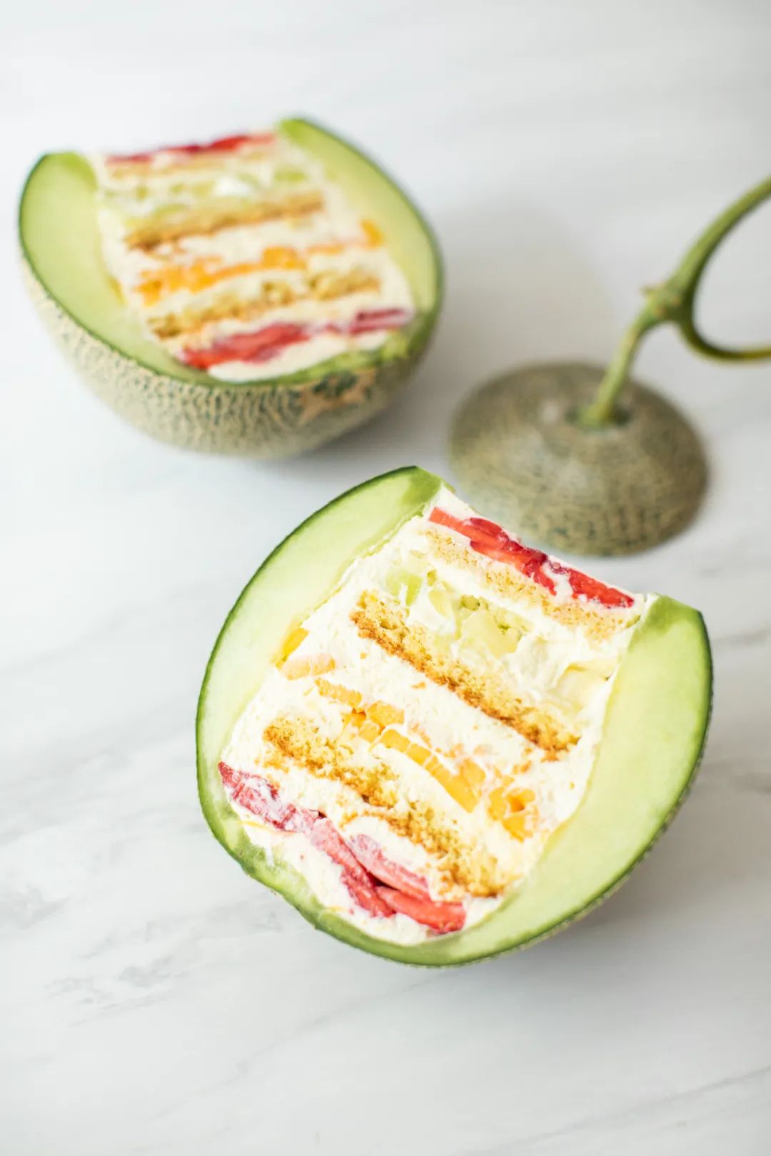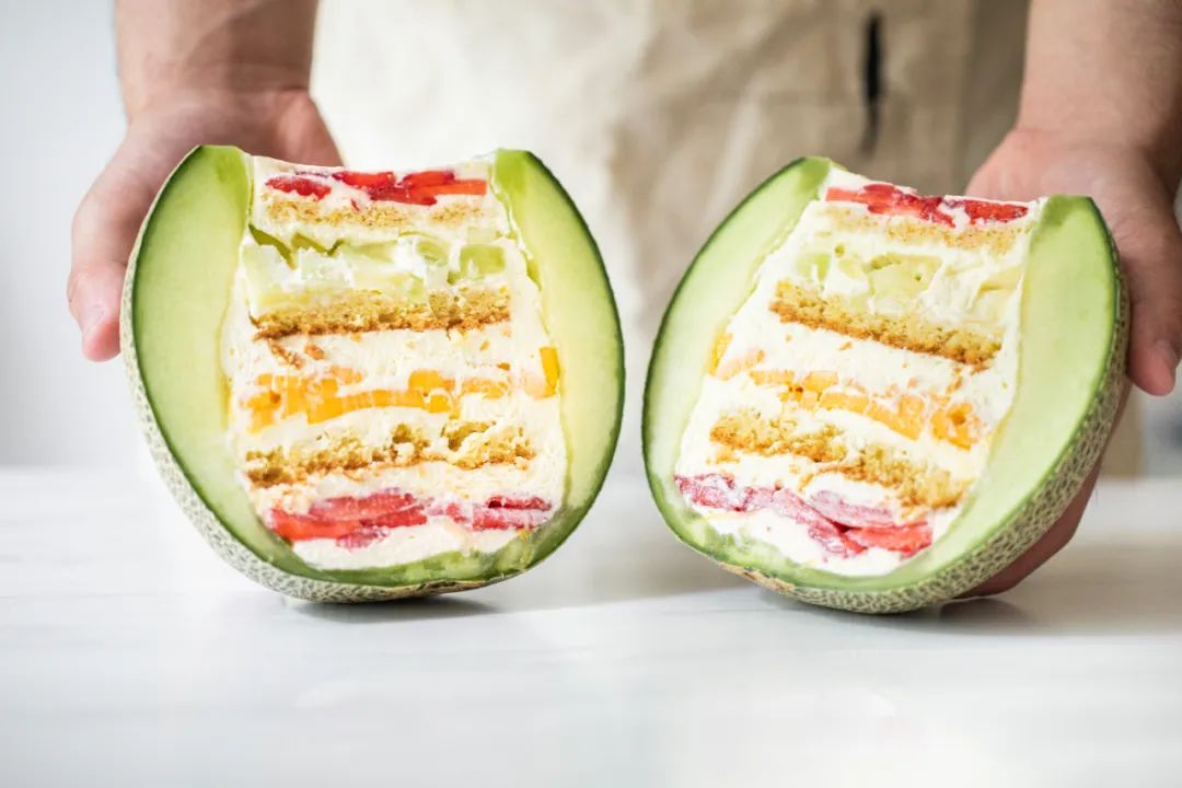 蜜瓜切开可以看到漂亮的分层,如同水果、奶油、戚风蛋糕的叠叠乐!冰镇着吃口感更棒,夏天必备的水果系甜品!