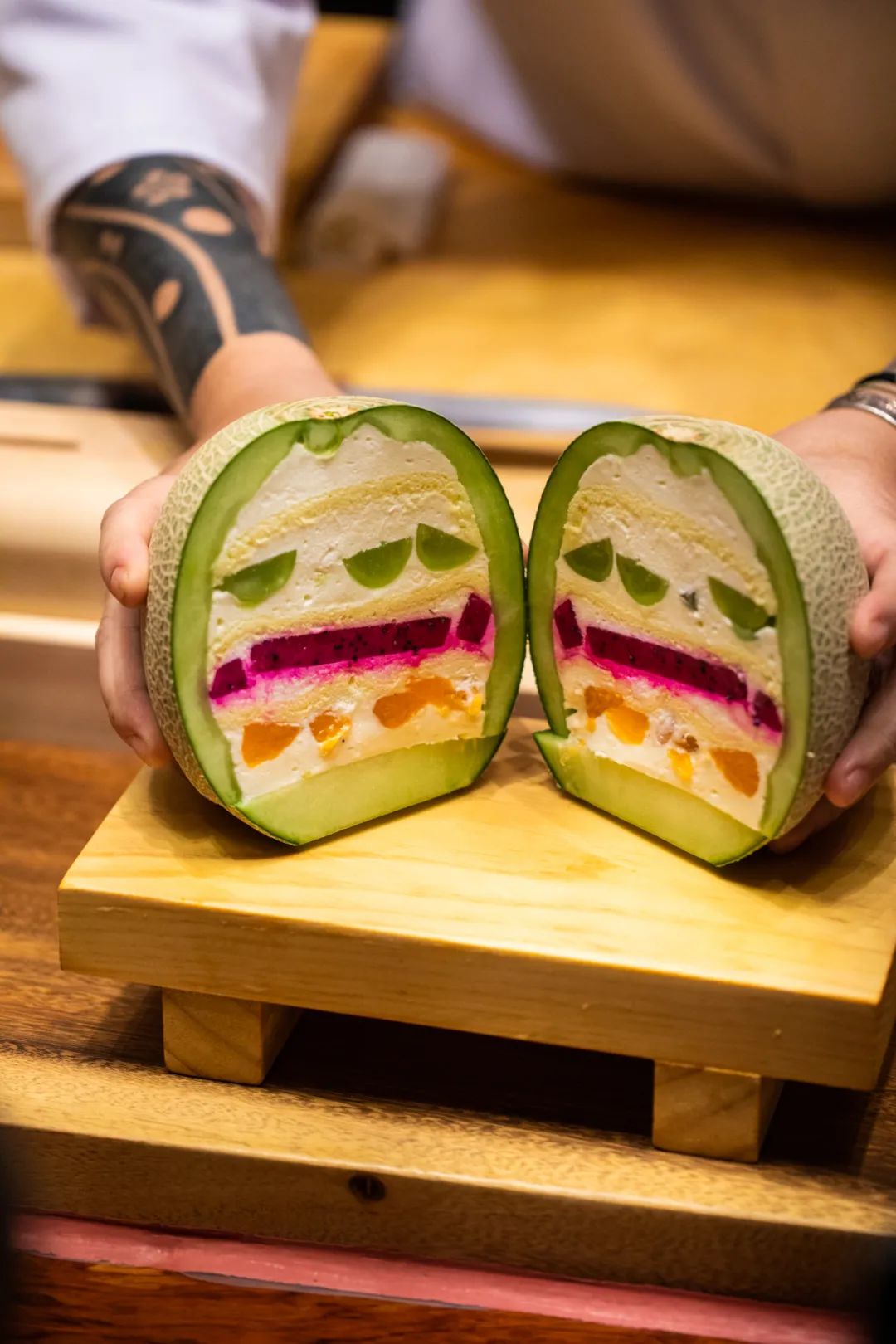 把奶油 - 蛋糕 - 奶油 - 水果一层一层加入蜜瓜里,层层叠叠铺进去,把瓜填满。