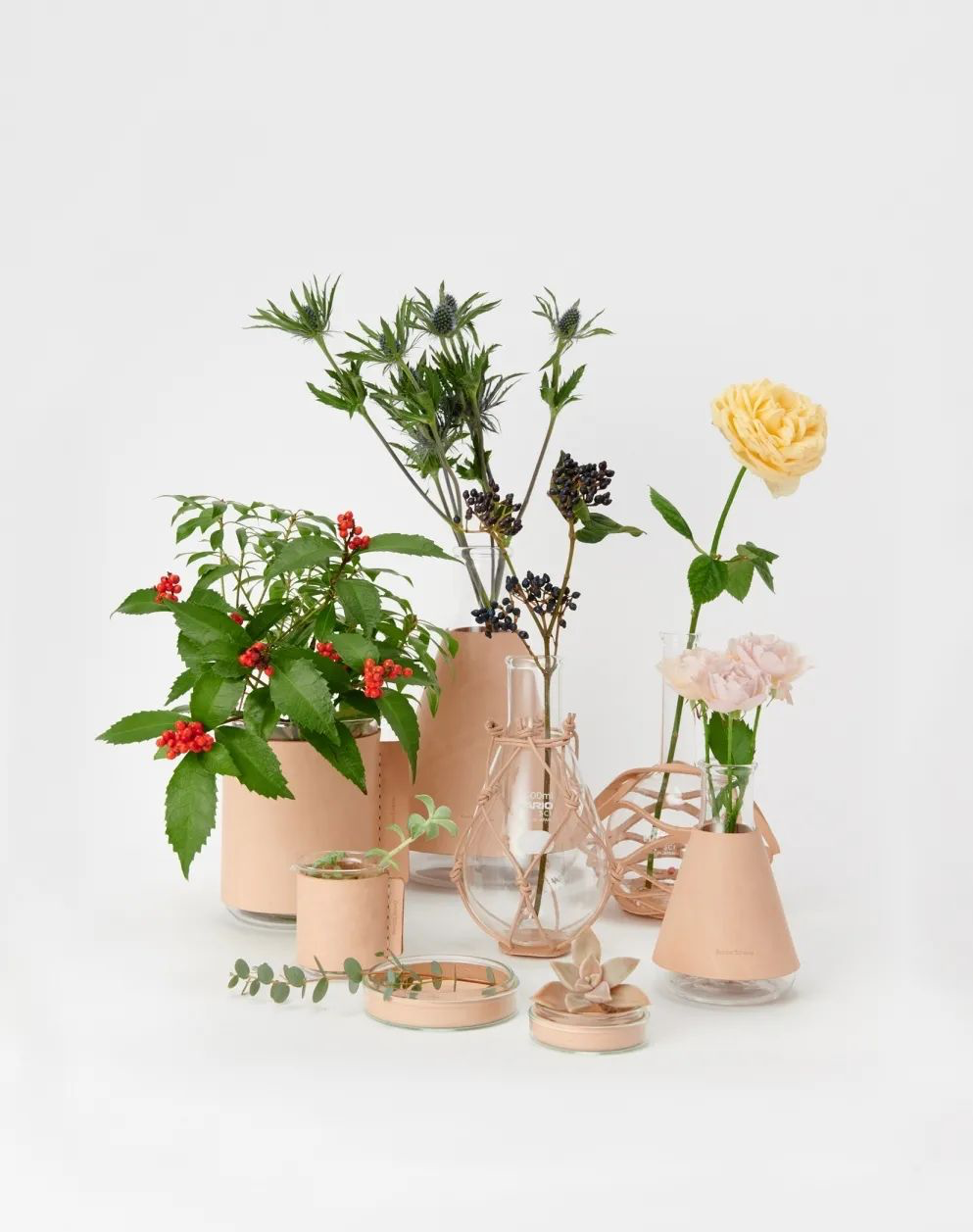 前不久Hender Scheme推出了一个玻璃花瓶系列,用品牌标识性的植鞣革素材包覆小巧的玻璃器皿,整个系列的完成度极高:
