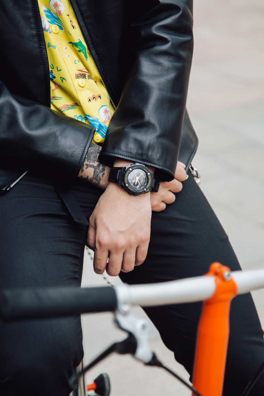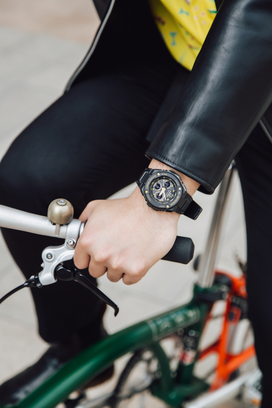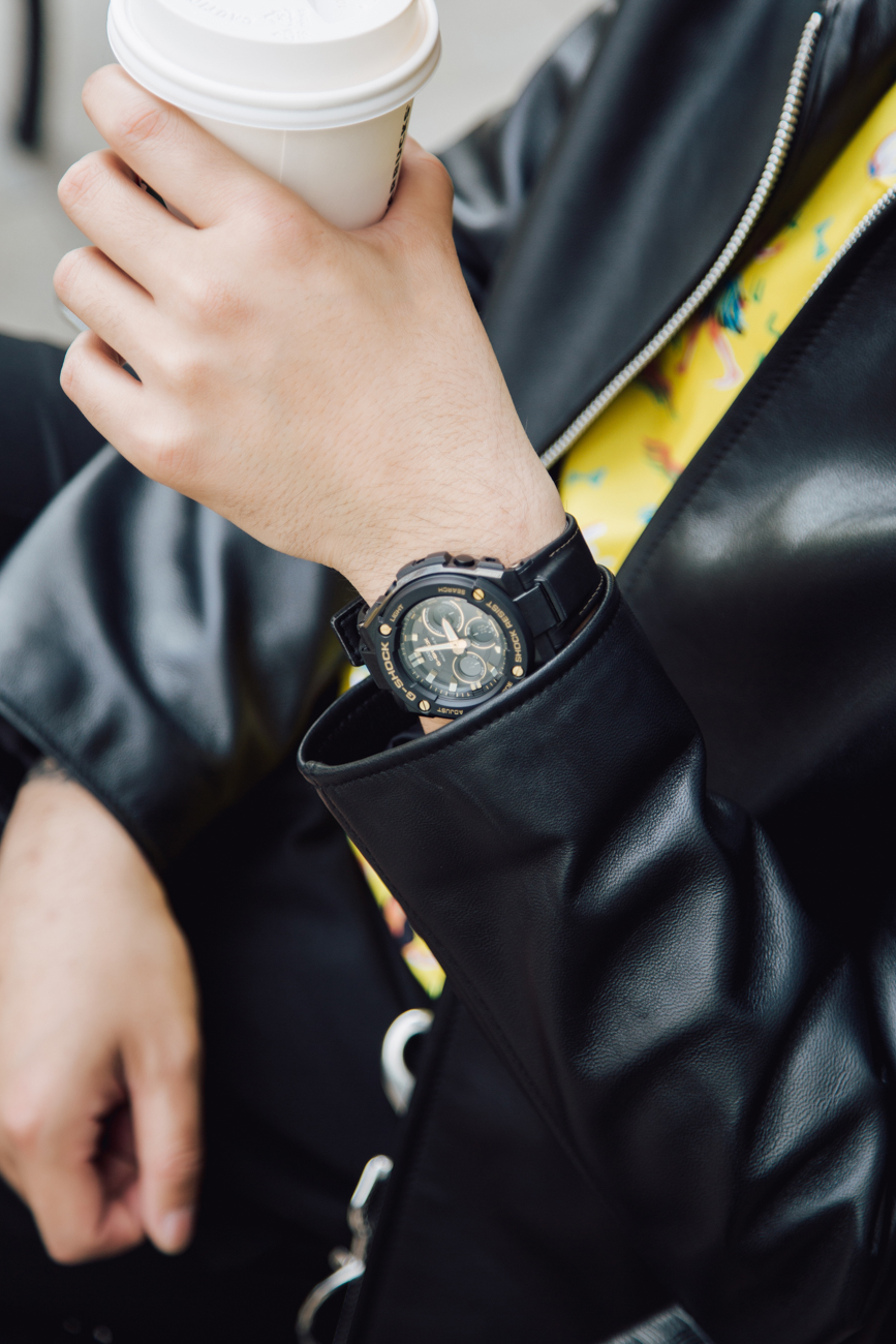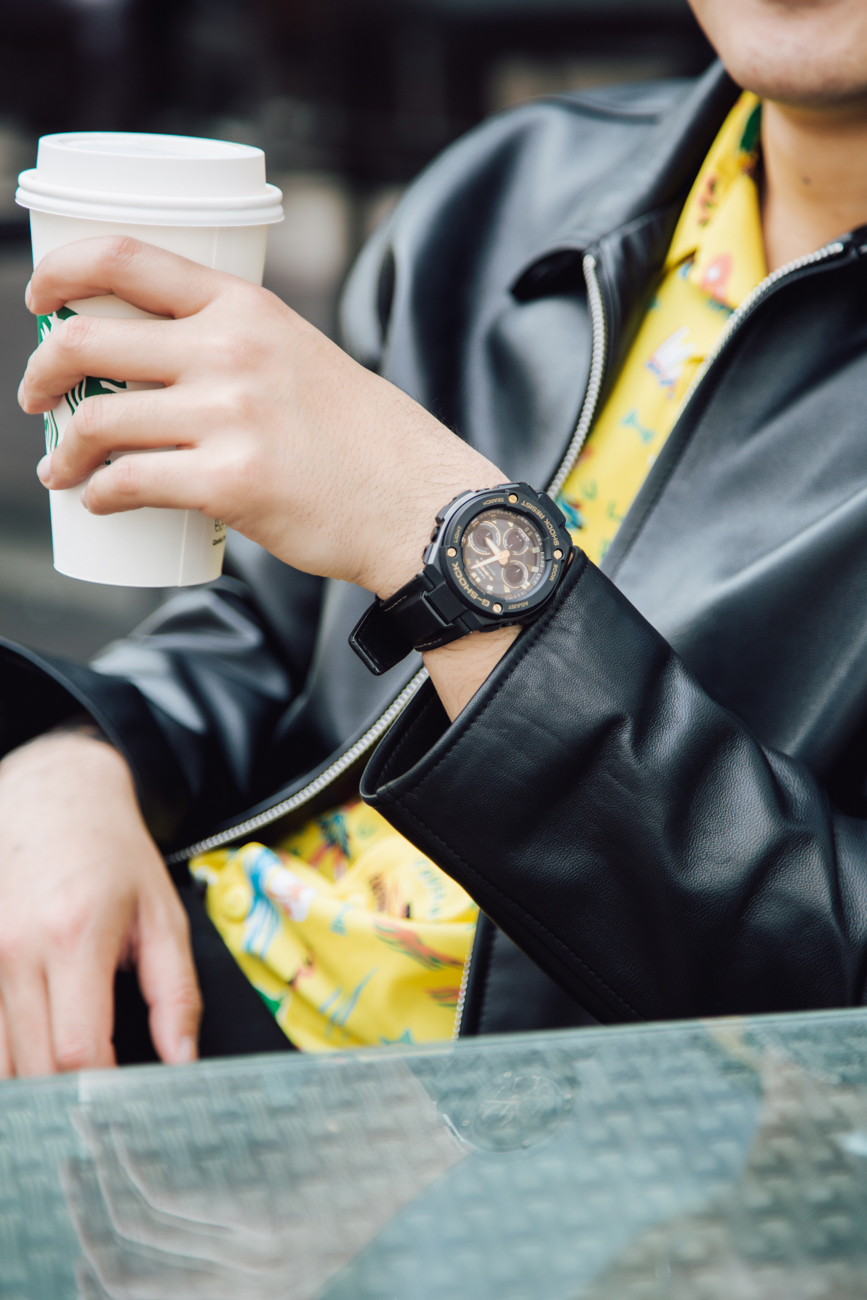 无论是硬朗的皮衣与黑色“Tough Leather”表带和表盘间的质感相互呼应,还是抢眼的金色细节与复古军事风格墨镜间的色彩碰撞,都能为你提供更多的时尚穿搭思考。下午的时光总是短暂而美好,当美味的咖啡唤醒你身体的动力之时,GST-W300GL-1APR则在一次次时间的律动之中,为你探索这座城市带来了更多的激情与灵感。