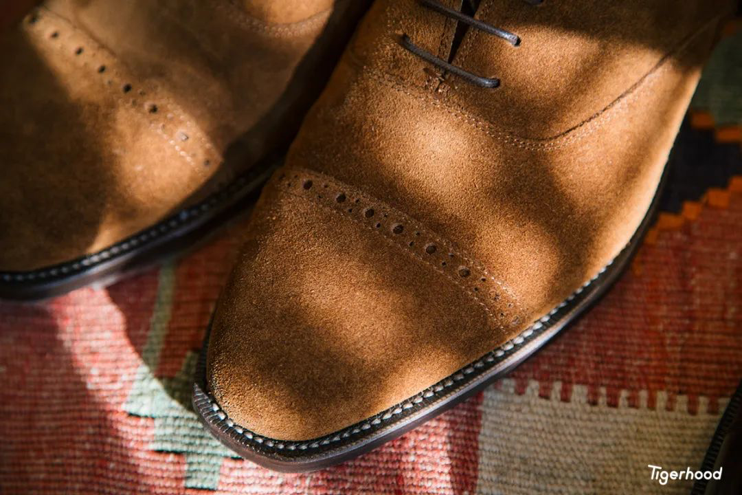 其次皮料为意大利 Mastrotto 厂提供的翻毛牛皮,并且采用固特异工艺进行手工制作。整体鞋型设计干净利落,鞋身翻毛的长度也非常合适。而且鞋底有贴胶,所以基本不会出现皮底容易打滑的状况,走起路来的脚感与摩擦力也很舒适。