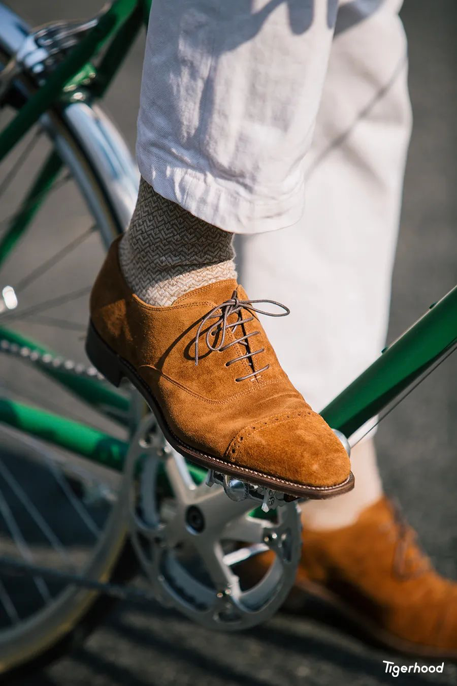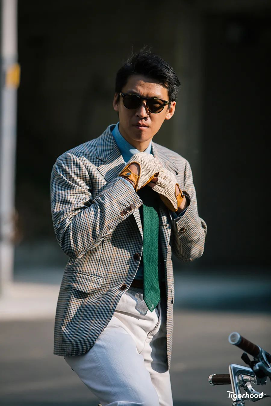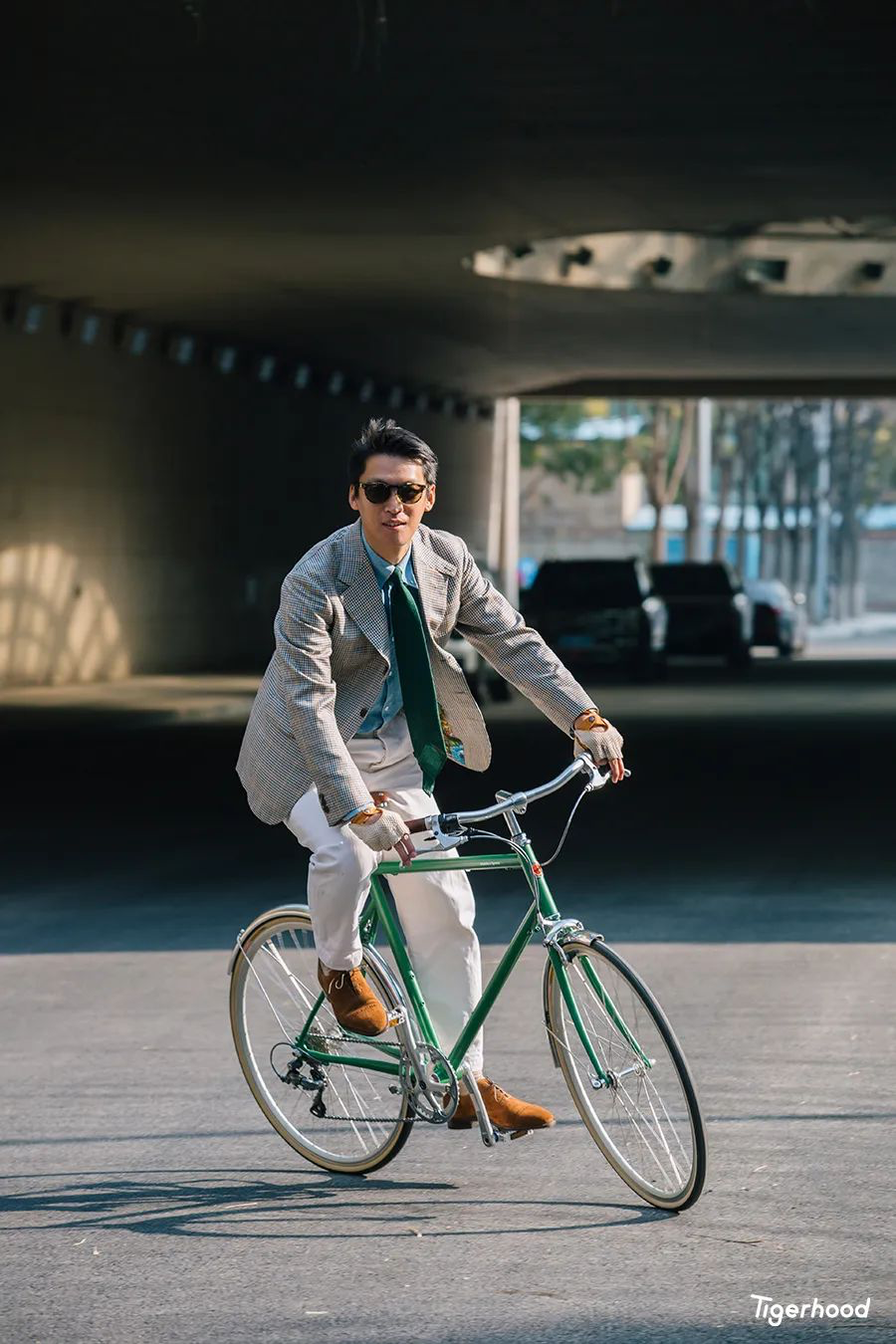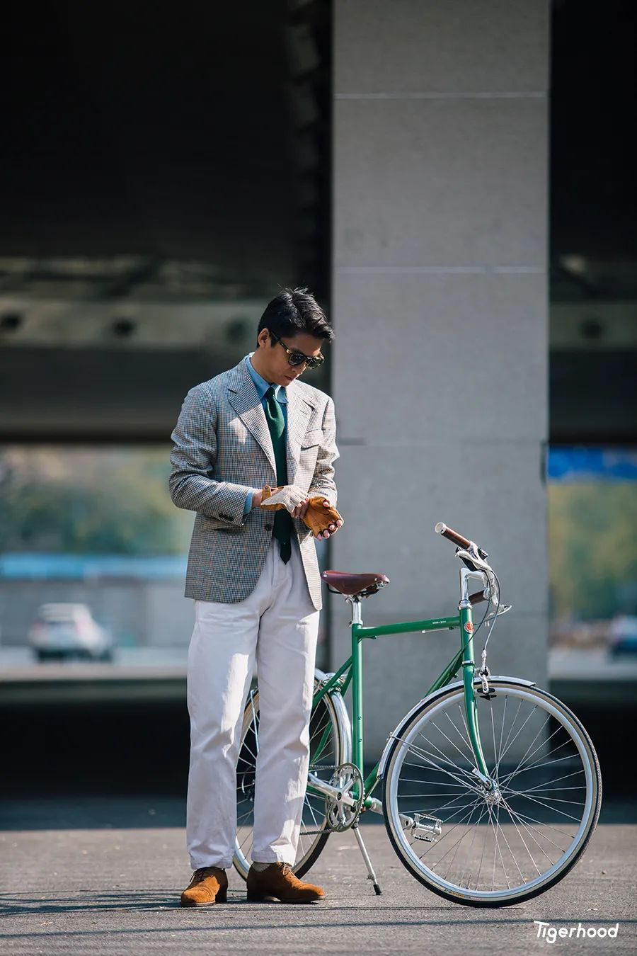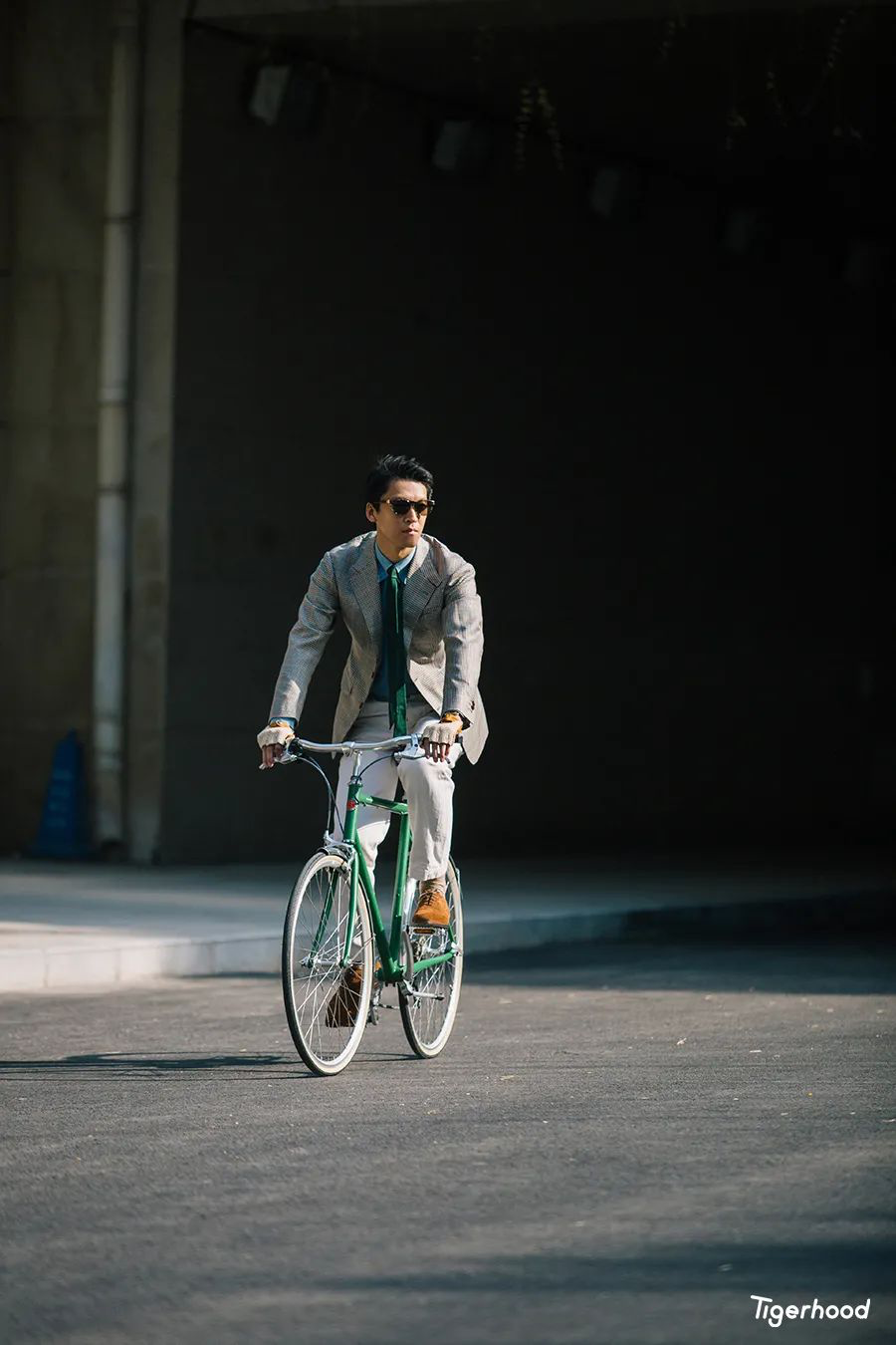 Izak:第一套造型主要是想把衣服和皮鞋的搭配与单车结合在一起。因为骑单车手会出汗,容易加快皮车把的磨损与老化,所以选择了一件与皮鞋相同色系的手套来进行搭配,既对应了配色同时又具有功能作用。