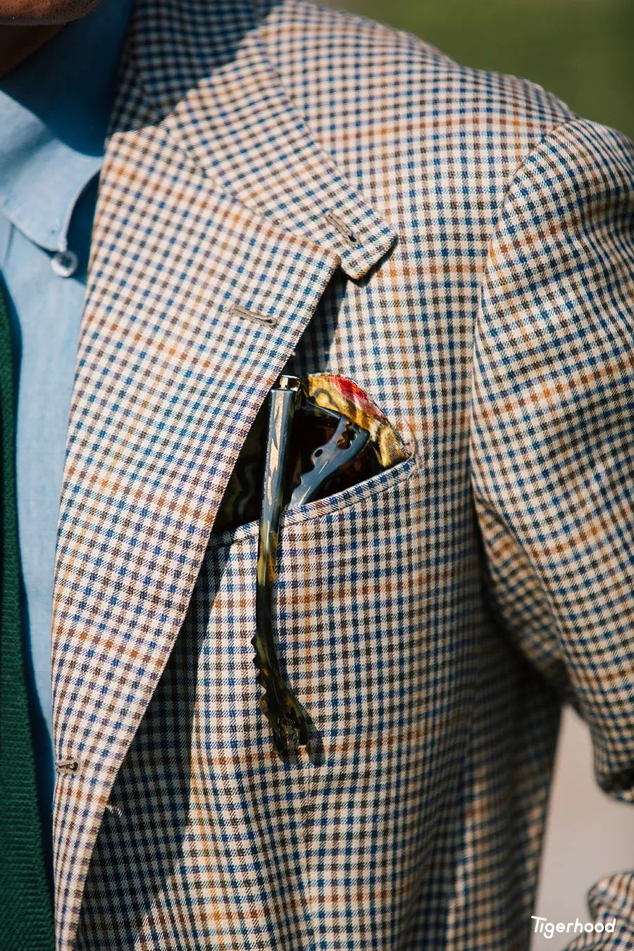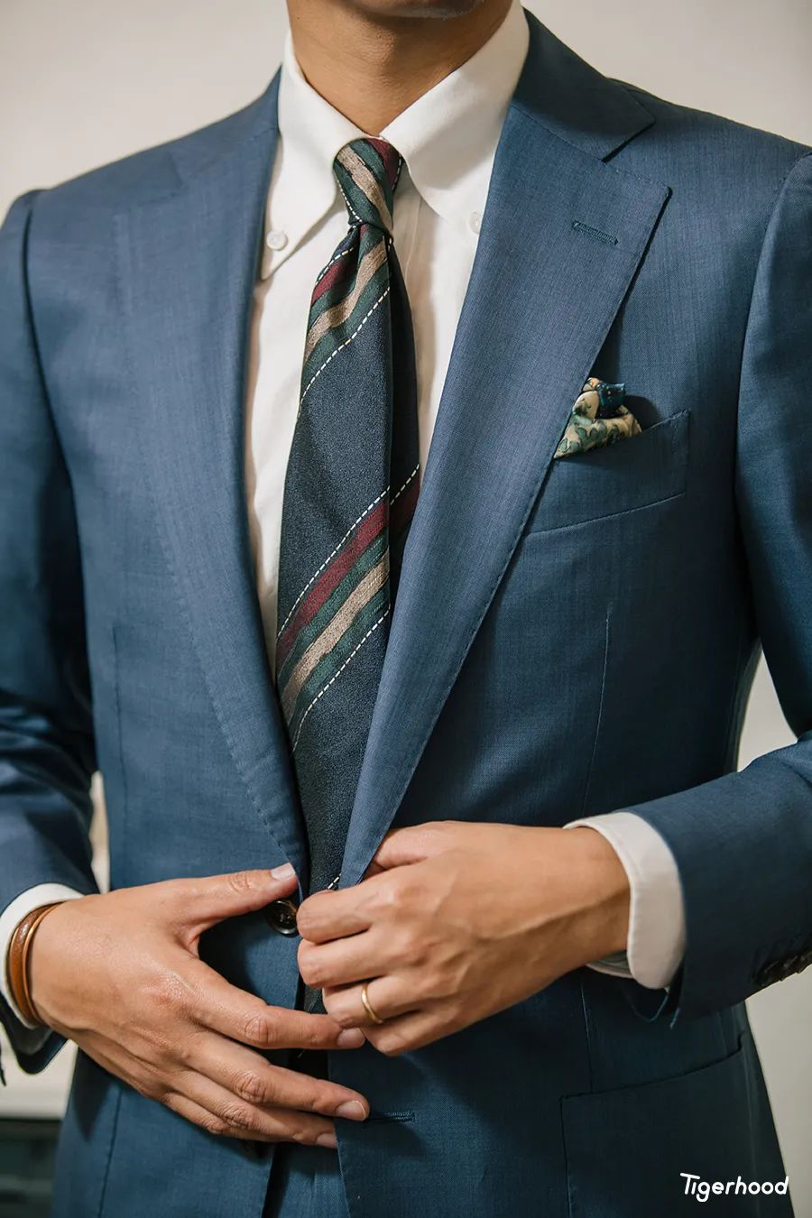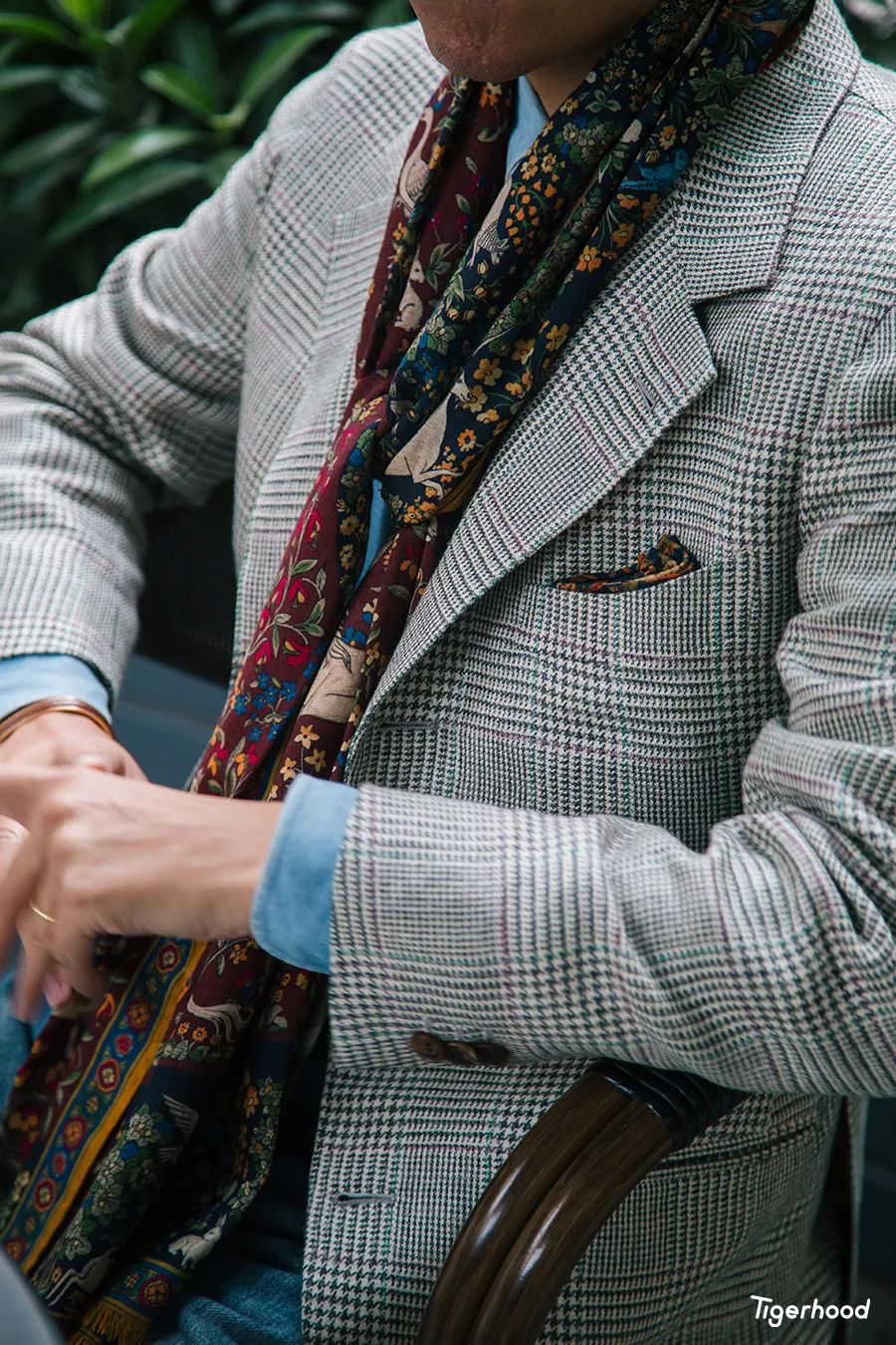这条看似花色较多的围巾,其实基础色系还是以酒红、蓝色、绿色为主,总的来说还是与上衣的细节颜色比较搭配,而且围巾还可以当作领带用。其次我还特别选用了一件相同色系的口袋巾来进行细节的修饰,这样在配色上就更为和谐。