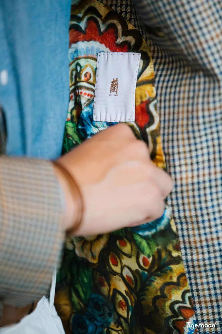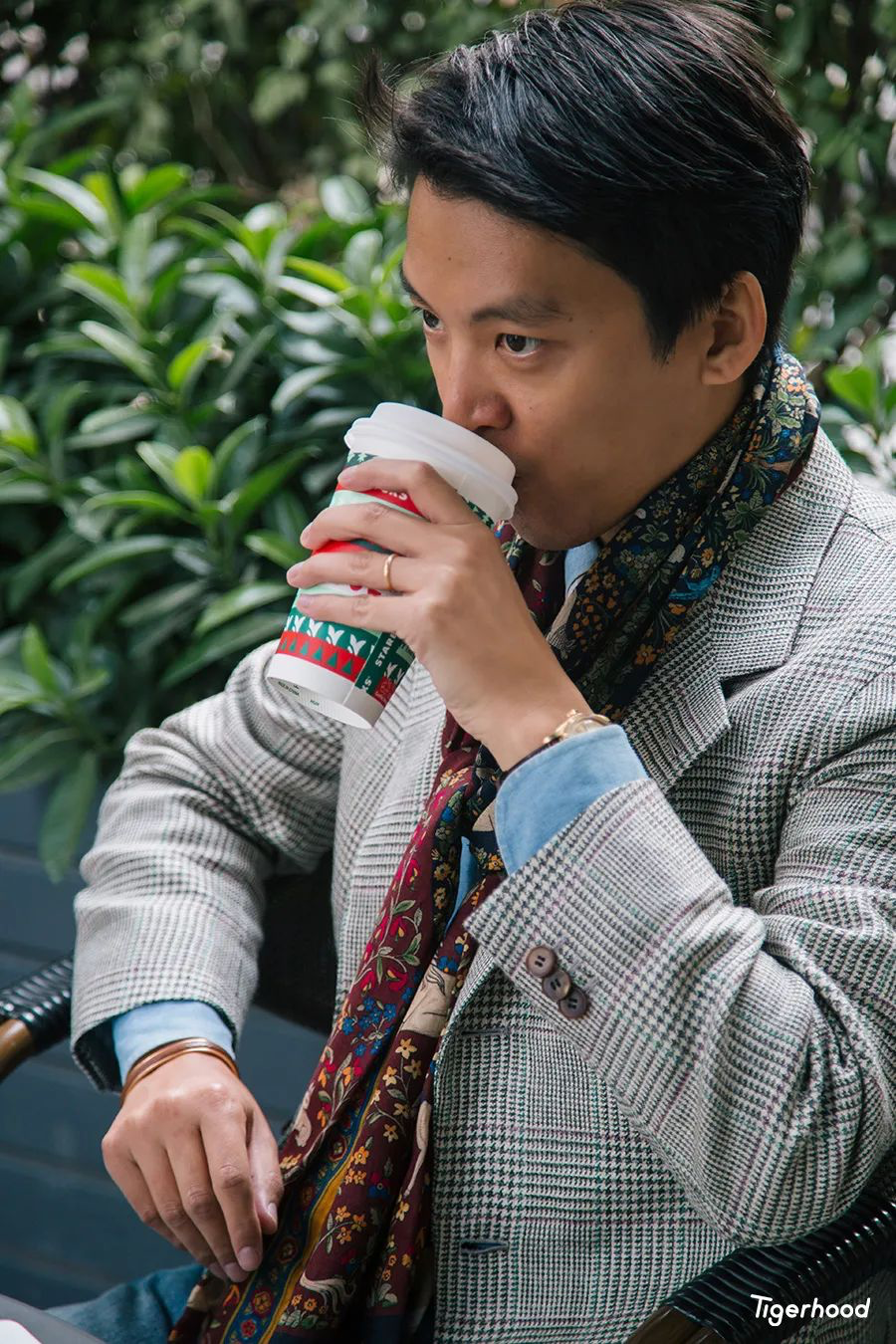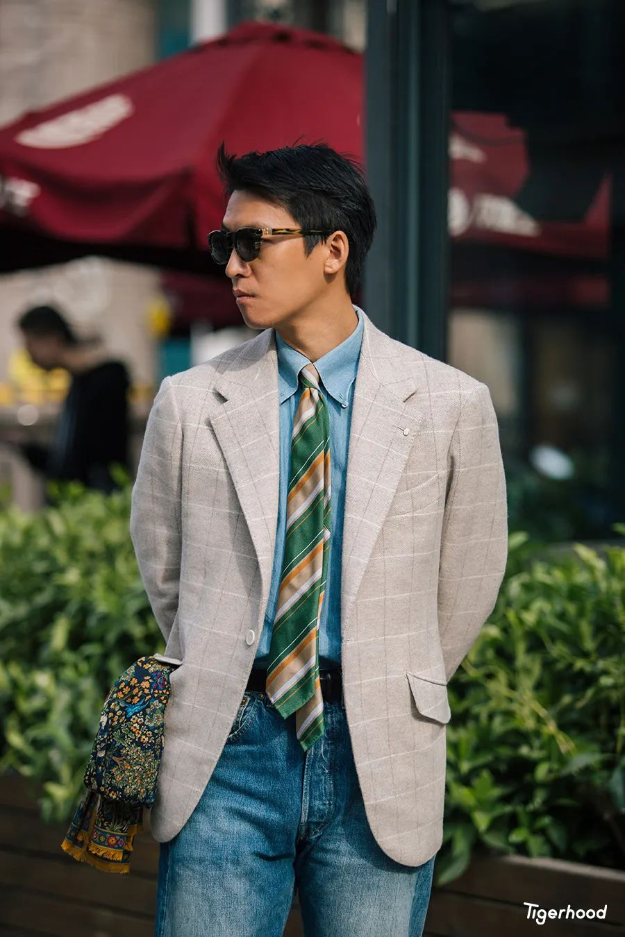 这条看似花色较多的围巾,其实基础色系还是以酒红、蓝色、绿色为主,总的来说还是与上衣的细节颜色比较搭配,而且围巾还可以当作领带用。其次我还特别选用了一件相同色系的口袋巾来进行细节的修饰,这样在配色上就更为和谐。