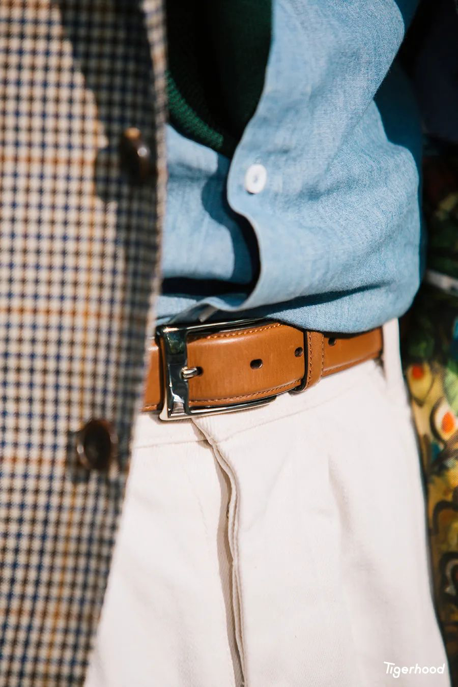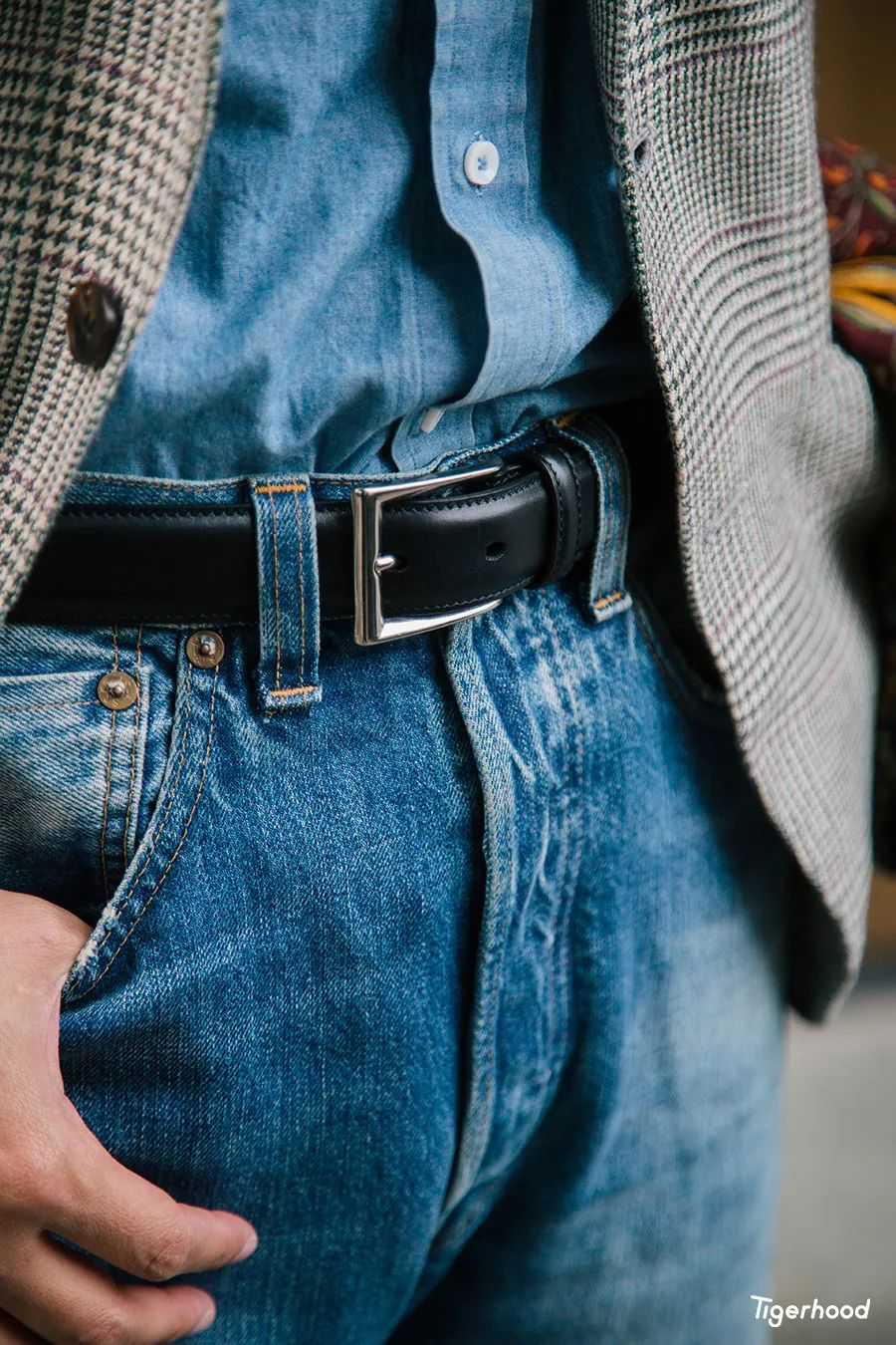 牛仔布衬衫,因为随着不断的穿着会产生色落,同样也比较休闲,然后与单车骑行过程中风景的变化有着不错的呼应。此外还选择了 MANNINA 的手工腰带与皮鞋的颜色进行搭配,腰带的皮料为德国 Weinheimer 厂的小牛皮。