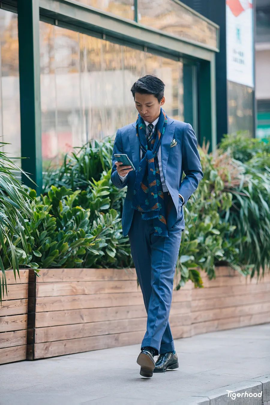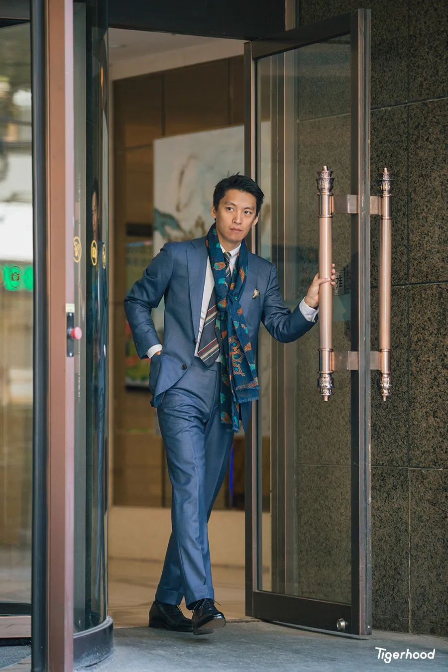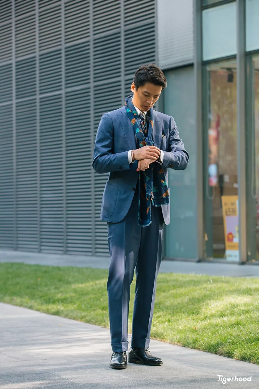 配饰方面则想将领带、围巾、口袋巾,作为一个整体。想要在职场中保持内敛,但同时又想营造出品质之感,那么配饰的颜色选择就十分重要。围巾特别选用了一条双面围巾,让蓝色印花元素更为低调的一面朝外与西服和配饰呼应。