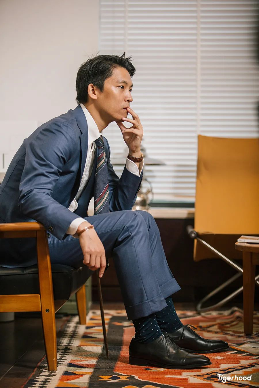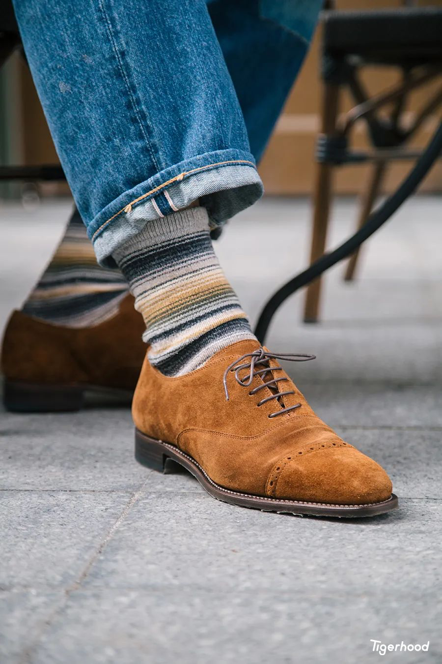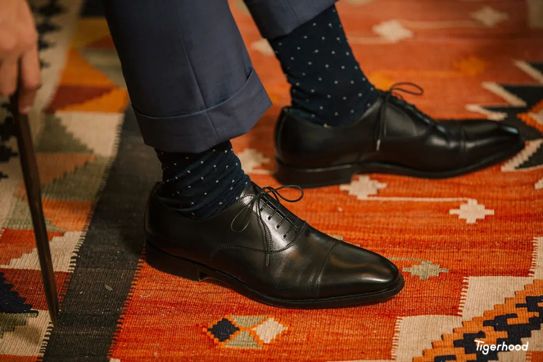 之所以选用这款袜子,主要考虑到上衣的条纹以及皮鞋的配色在细节上进行呼应。