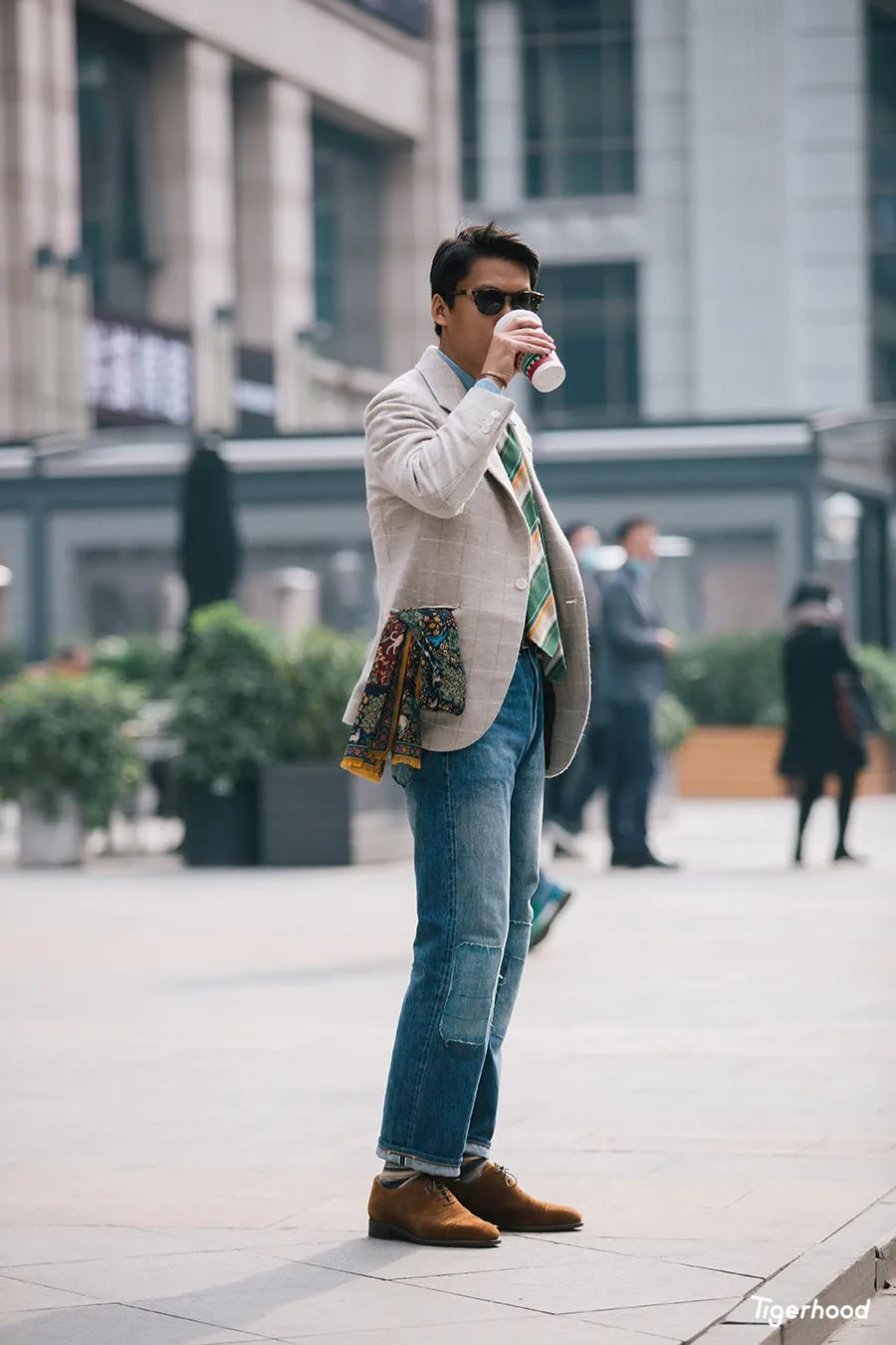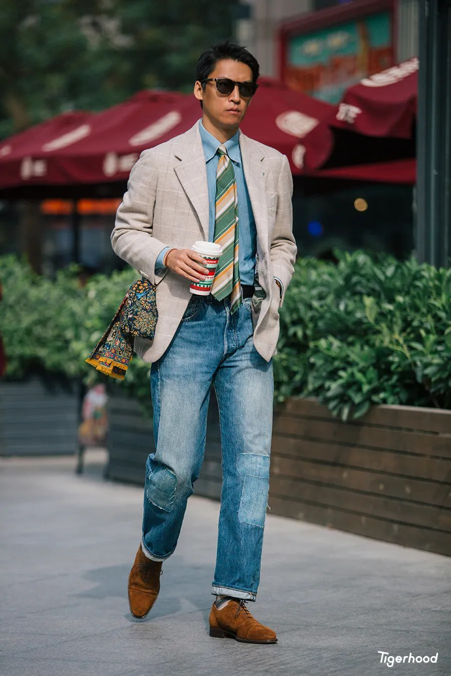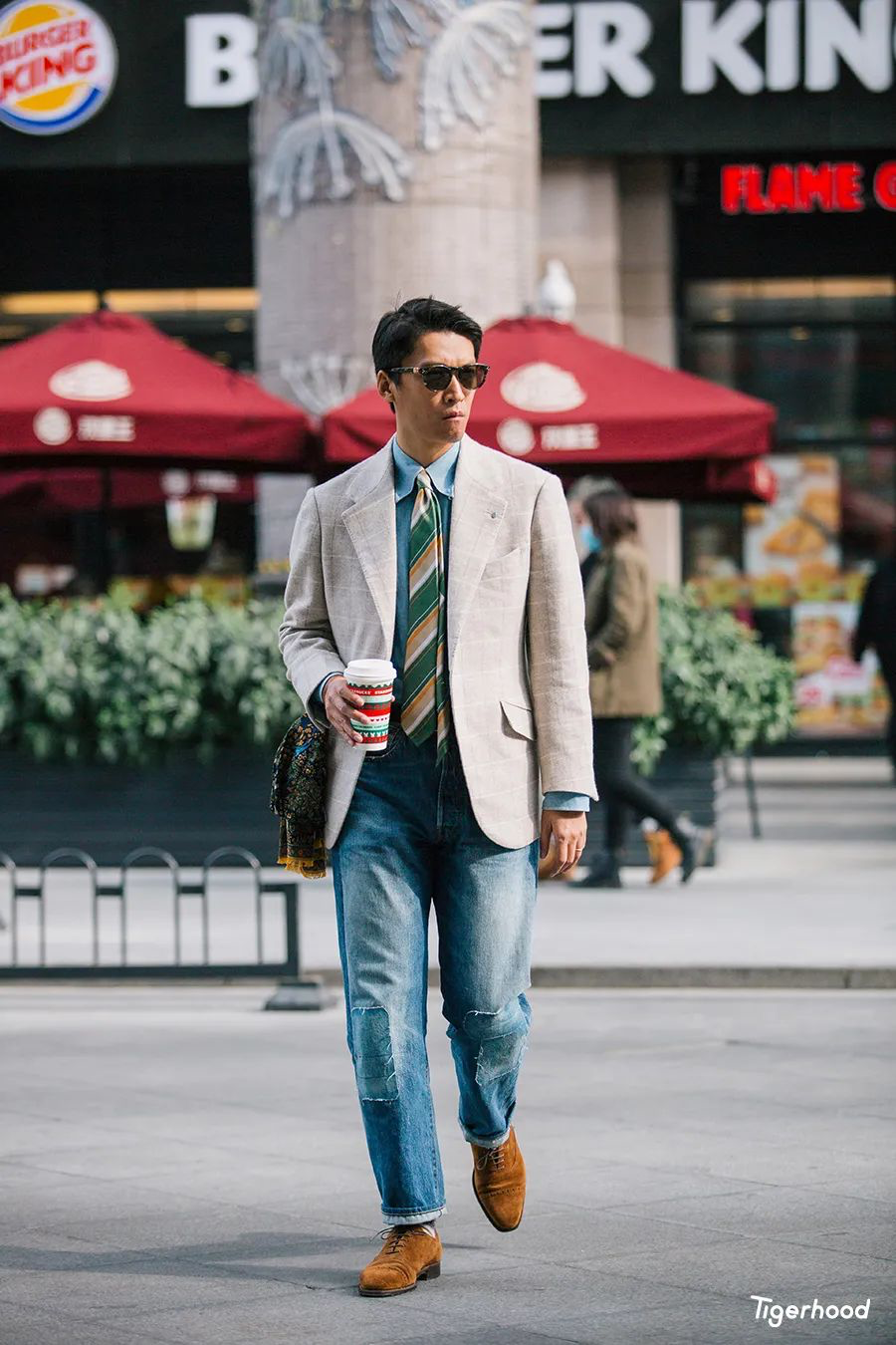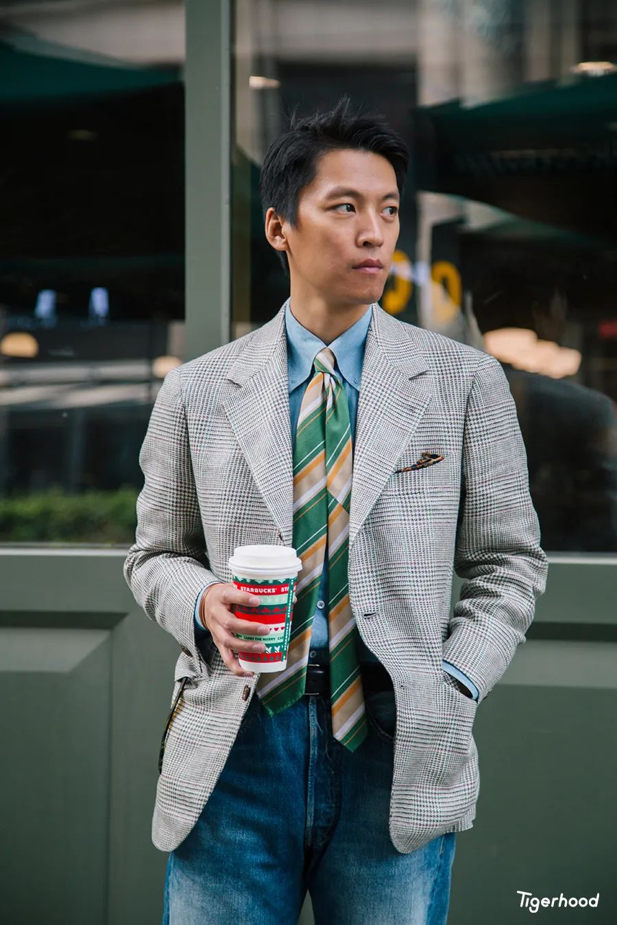 Izak:第四套造型因为这件西装夹克本身就比较合体,所以无论搭配军事风格裤装或者复古洗水牛仔裤均可,但建议还是根据夹克本身的面料和颜色进行判断。