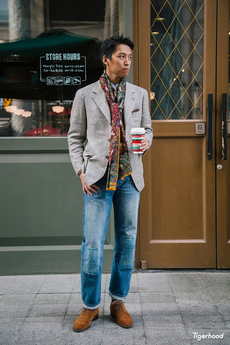 此外这款围巾的材质是真丝和羊毛混纺的,触感比较柔软,可以与 MANNINA 翻毛牛津雕花皮鞋从质感上进行搭配。而且因为 MANNINA 这些年经过日本市场的适应与重新开发后,对于亚洲高脚背的人群真的非常友好,一天走下来特别舒适,让我对他们的定制服务更加期待了。
