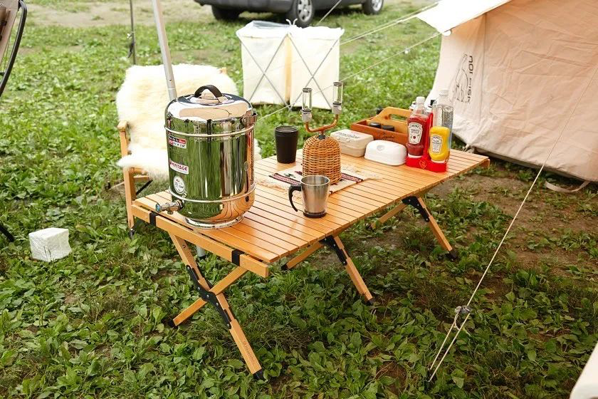 下图中这种很多户外品牌都有推出的折叠木桌就是一个性价比很高的选择。