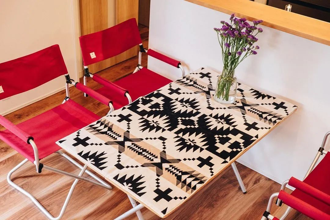 除此之外,直接将一些实木材质的户外露营桌椅置放在客厅也不失为一个可行性很高的方案,但这需要周围有一些DIY的实木设计来呼应,搭建出一定的体系性。