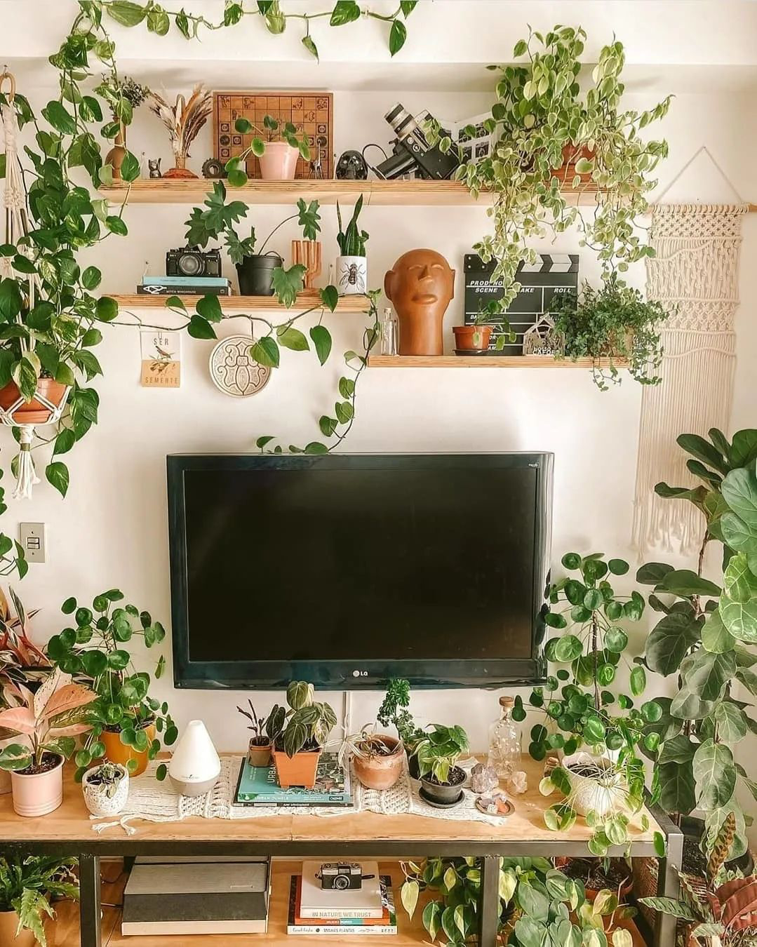 同理这种绿植陈设思路也可复制在电视机周围: