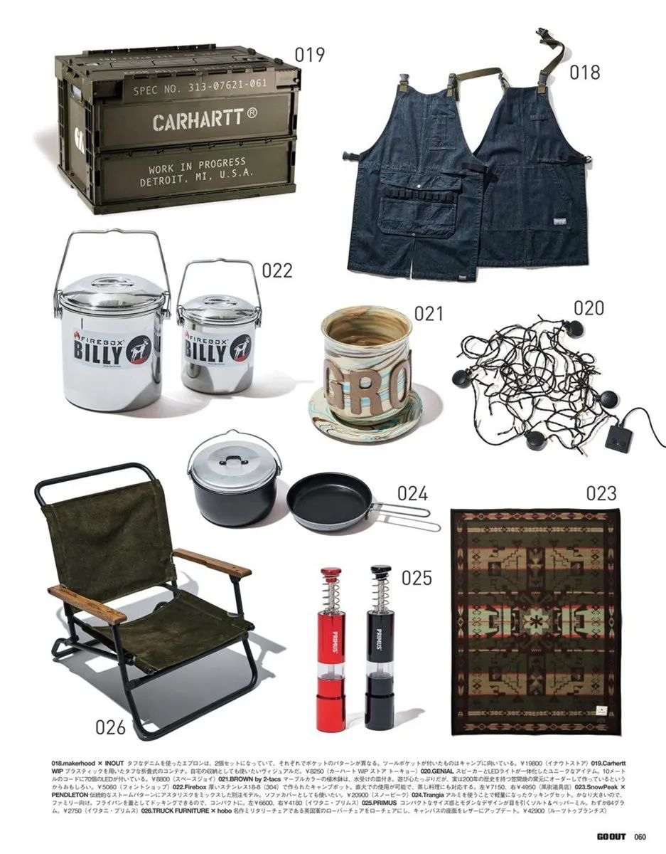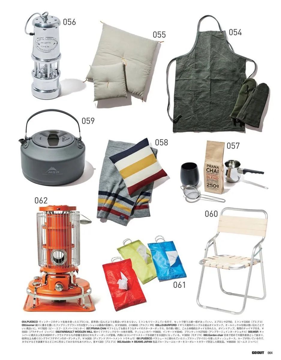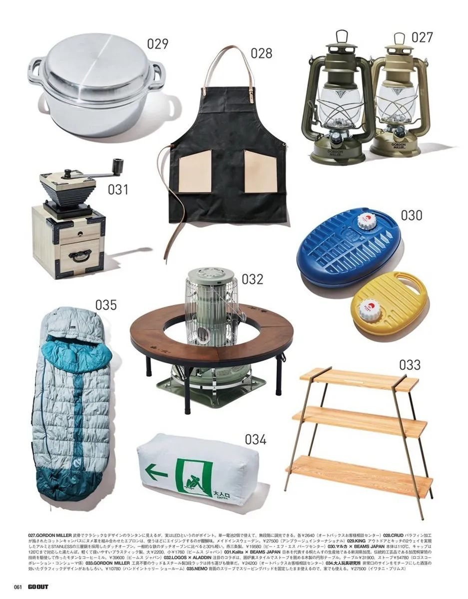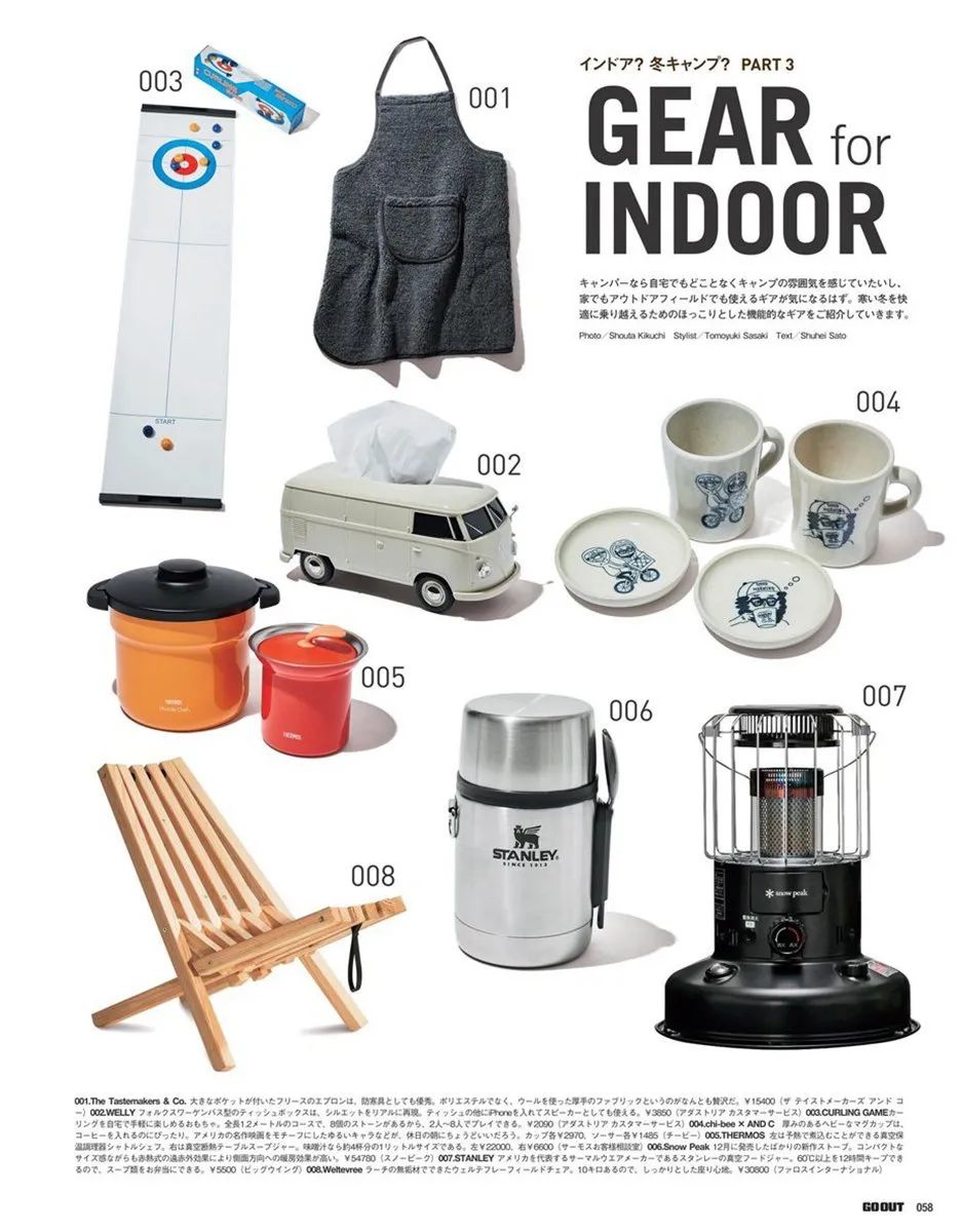 以上提到的四点也仅仅是为大家提供一个思路,除此之外,2020年2月号《GO OUT》杂志就专门整理出“GEAR for INDOOR”装备清单,十分贴心地为各位户外露营文化爱好者们提供了直观的装备选择,有兴趣的朋友可以去翻阅2020年2月号《GO OUT》原版或者电子版,下面就先为大家展示“GEAR for INDOOR”装备清单其中的一部分: