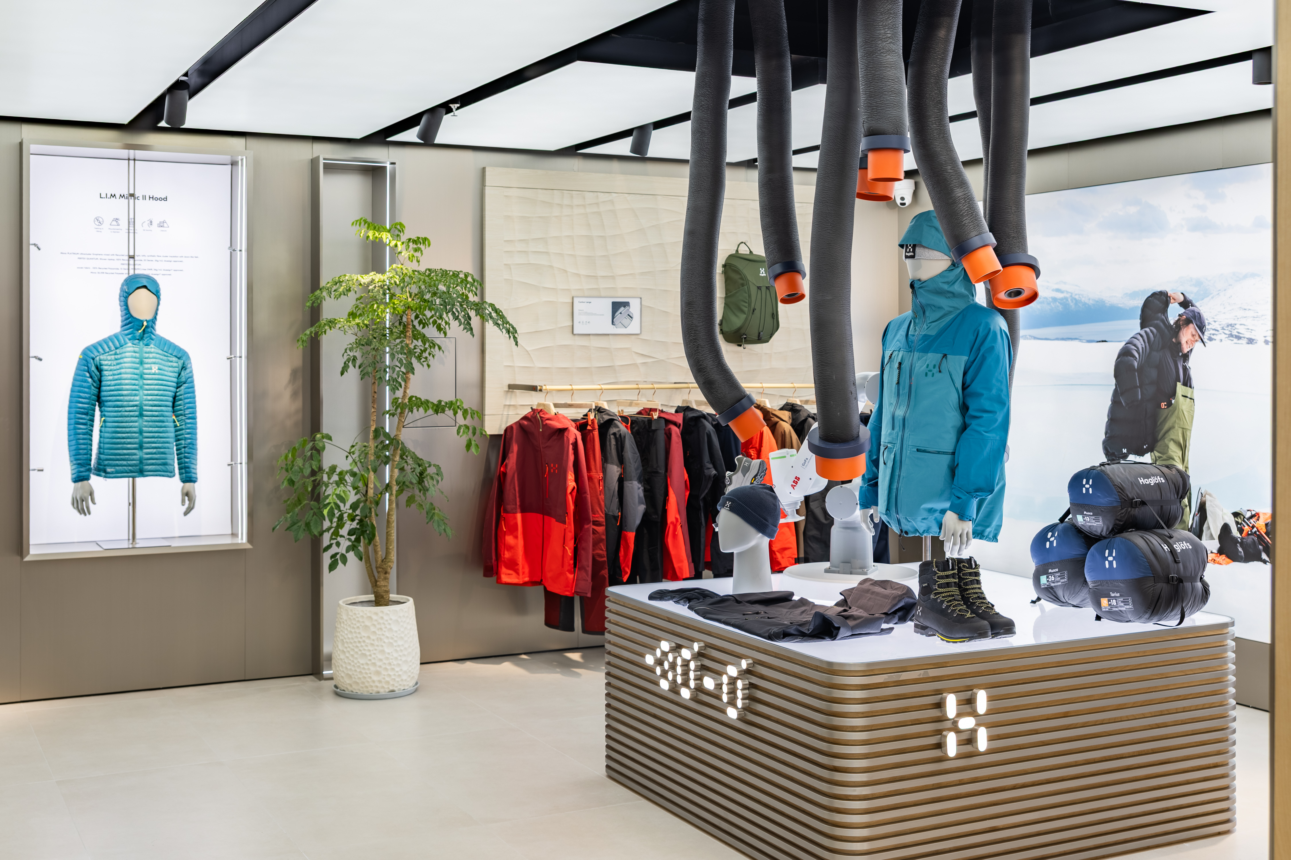 1楼主打Melting Glacier(冰川入海) 主题,八根山峰造型立柱对应北欧八座山脉的缩影,木纹与天然材质的运用娓娓道来Haglöfs的百年户外发展史,品牌全系列装备矩阵——VASSI、L.I.M Series、Roc Flash、Spitz等悉数陈列。
