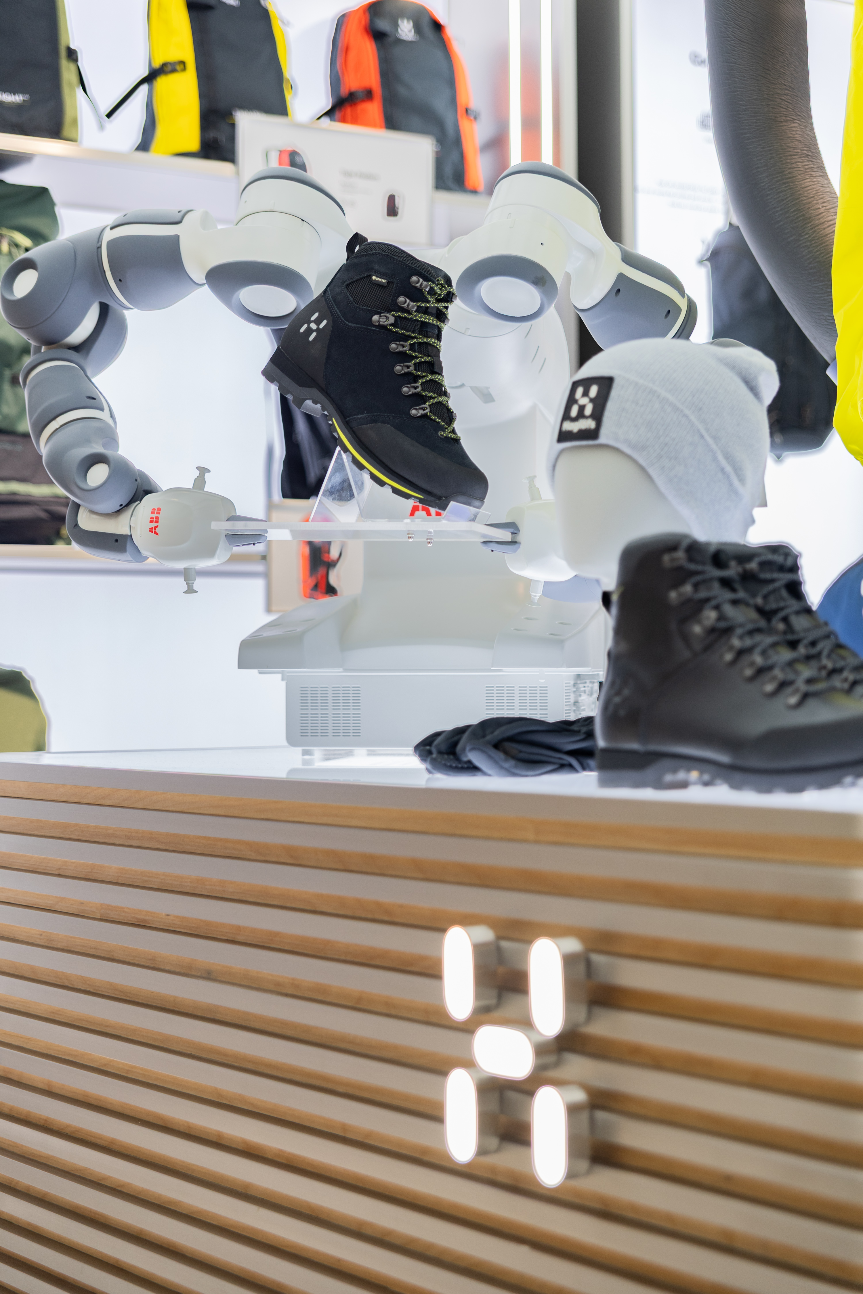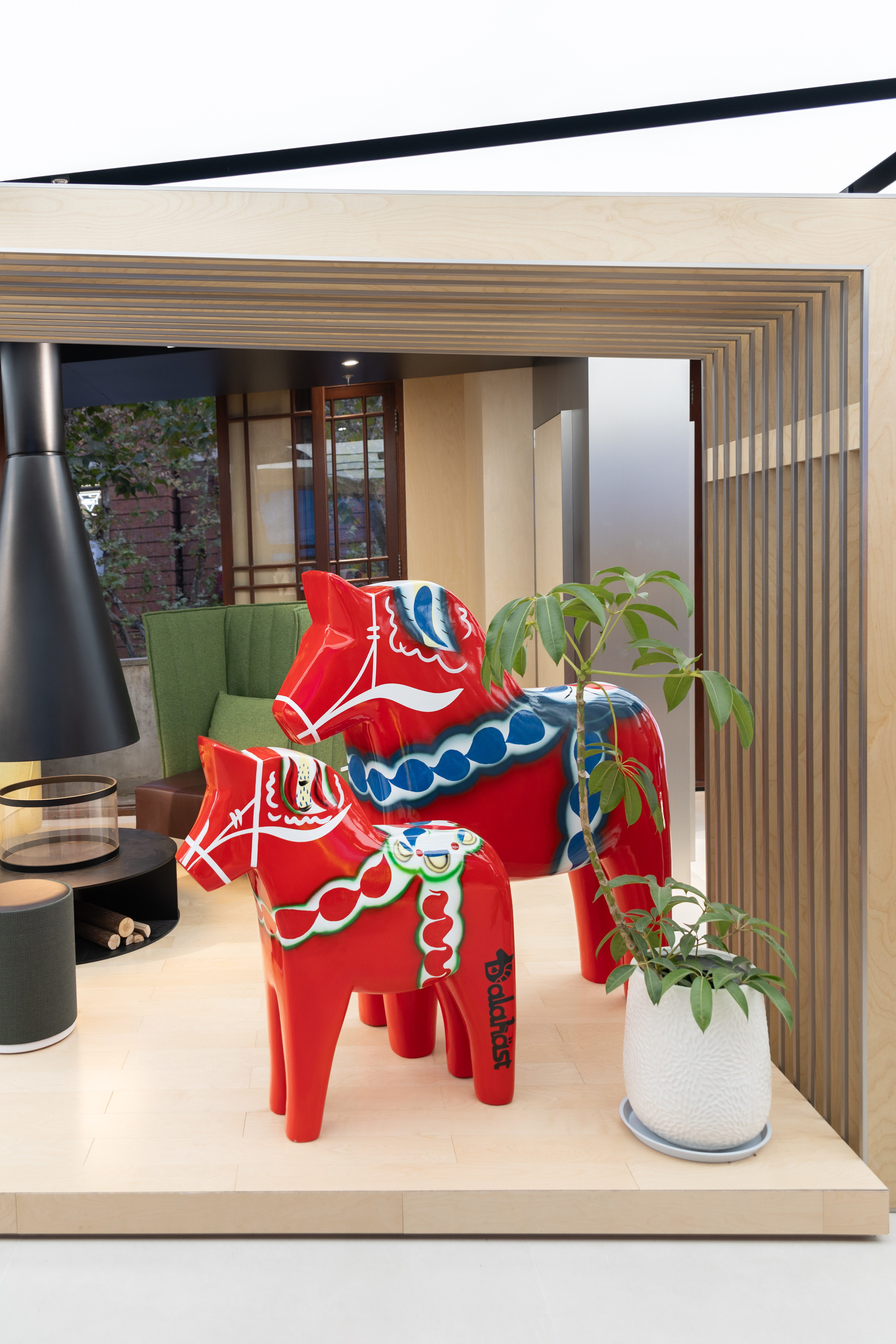 2楼主打The Extreme Weather(极境装备圣殿) 主题,融合科技 × 装备 × 瑞典文化三层理念。ABB机械臂的陈设,诠释着瑞典的科技实力与工程美学;源自达拉纳省的文化图腾Dala木马,是品牌文化根源的具象表达;法伦红木屋试衣间复刻瑞典传统Falun Red木屋风貌,带来沉浸式的北欧乡野换装体验;二楼的中心区域用“Stuga”(小木屋)作为瑞典Fika文化的生动载体。Fika是一天中的某个时刻,停下来喝杯咖啡、吃点甜品,和朋友、家人或同事聊聊天,放松一下的时光;小木屋为人们提供灵感交流与惬意陪伴的空间。