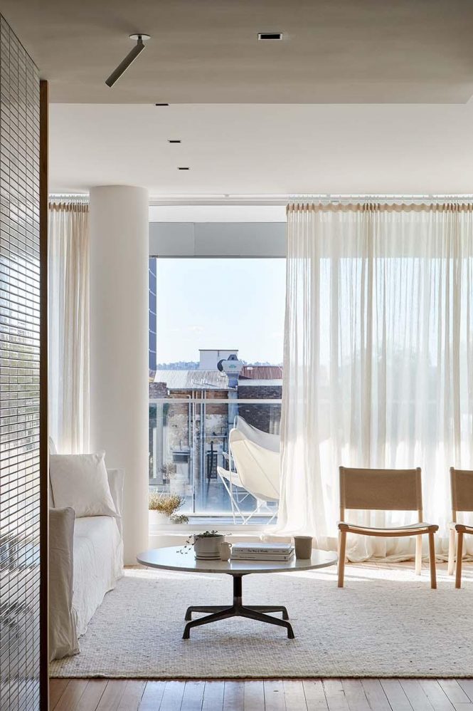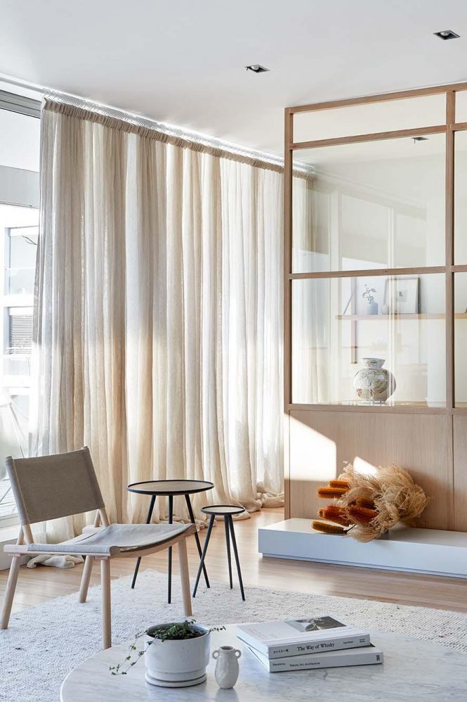 为此在整面墙体加入了落地窗设计,将大量自然光引入屋内。同时在考虑到屋主人有着大量的艺术品收藏需要展示,所以建筑中还加入了画廊的美感。此外特别定制的原木家具和日式风格细节,在阳光透过的窗纱下显得格外温柔。