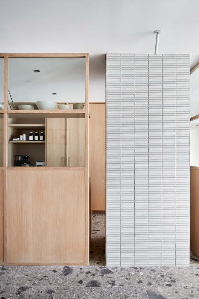 特别打造的厨房区域则把日式美学进行了很好的展现,专属定制的原木储物架不光有着收纳的功能性,同时特制的玻璃隔断也让采光得到了很好的保证,而遍布厨房的原木色家具设计则又满足了日式风格的需求。