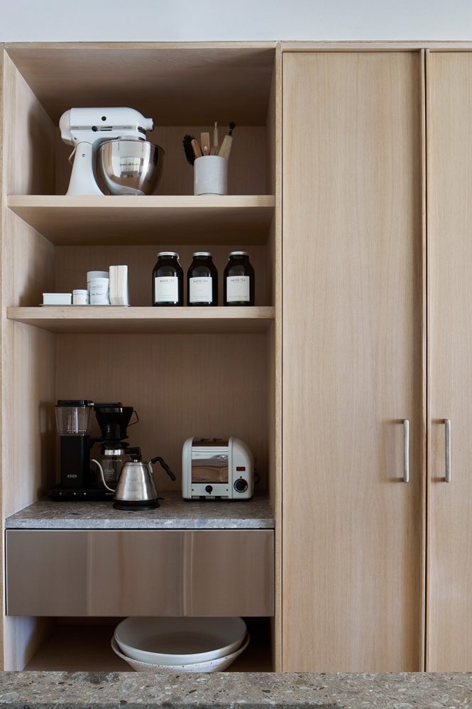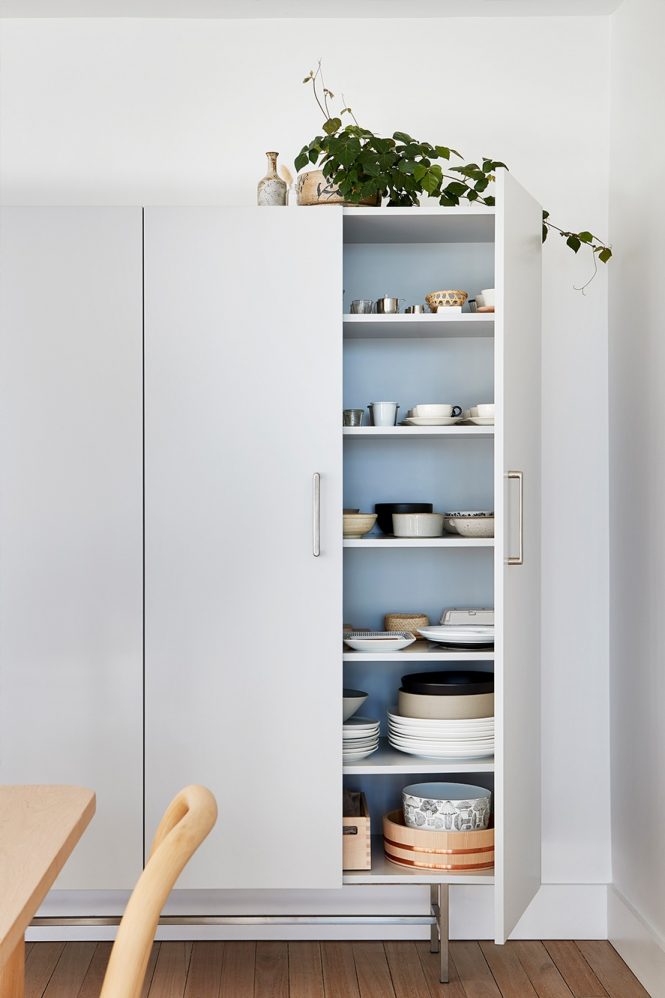由于屋主对于陶艺器具非常喜欢,所以在餐厅旁还特别加入了展示收藏柜的设计,打开柜门后当所有的藏品展现出来之后,即可看出屋主对于生活的热爱和不俗的品位。而墙壁上来自艺术家 Lottie Consalvo 的作品也与整体环境有着不错的互动。
