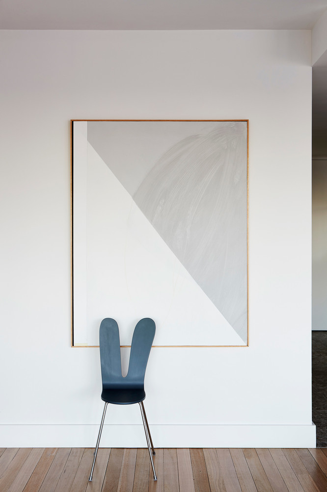 客厅里这把超级可爱的兔子椅,由日本建筑师团队 SANAA 打造。3000多元一把的售价虽然昂贵,但如果小朋友从小在这种高品位美学氛围下成长,也不失为一笔很好的投资。墙上的画作则来自于艺术家 Michael Bennett 的作品。