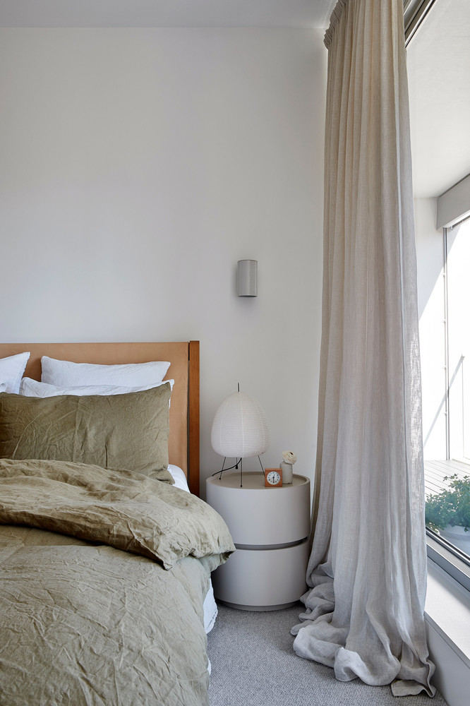 可以看出屋主对于野口勇大师的设计绝对是真爱,床头依然摆设了他的灯具作品。床上用品来自于澳洲本土家纺品牌 IN BED。