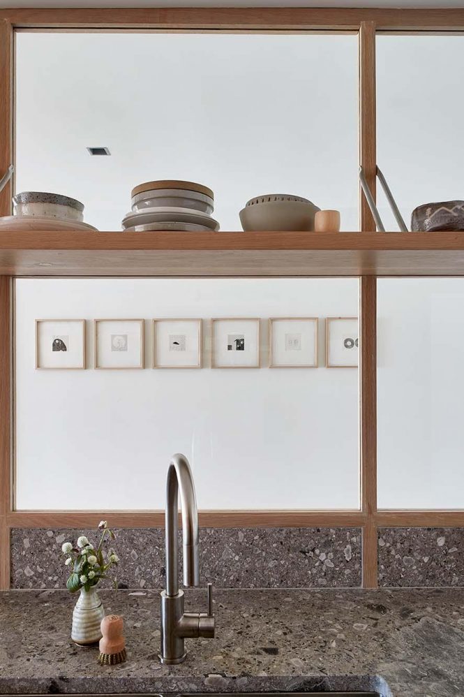 光是想想在这样的充满悉尼清晨阳光的厨房里做早餐就让人觉得幸福。透过洗手池玻璃外挂在墙壁上的艺术品,则来自于日本著名插画艺术家大桥步的作品,真的很让人惊叹屋主对于艺术家的多元涉猎。