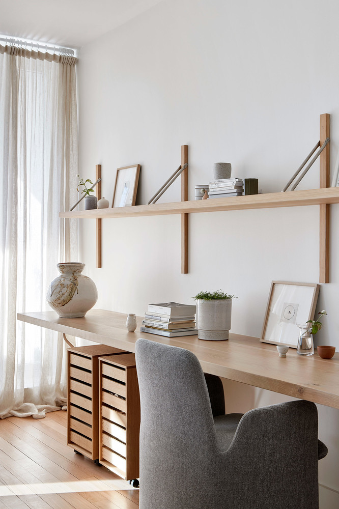 办公桌旁的椅子是屋主,早年收藏于意大利家具现代设计巨匠 Rodolfo Dordoni 的作品。花瓶则来自于澳洲本土品牌 Anchor Ceramics。