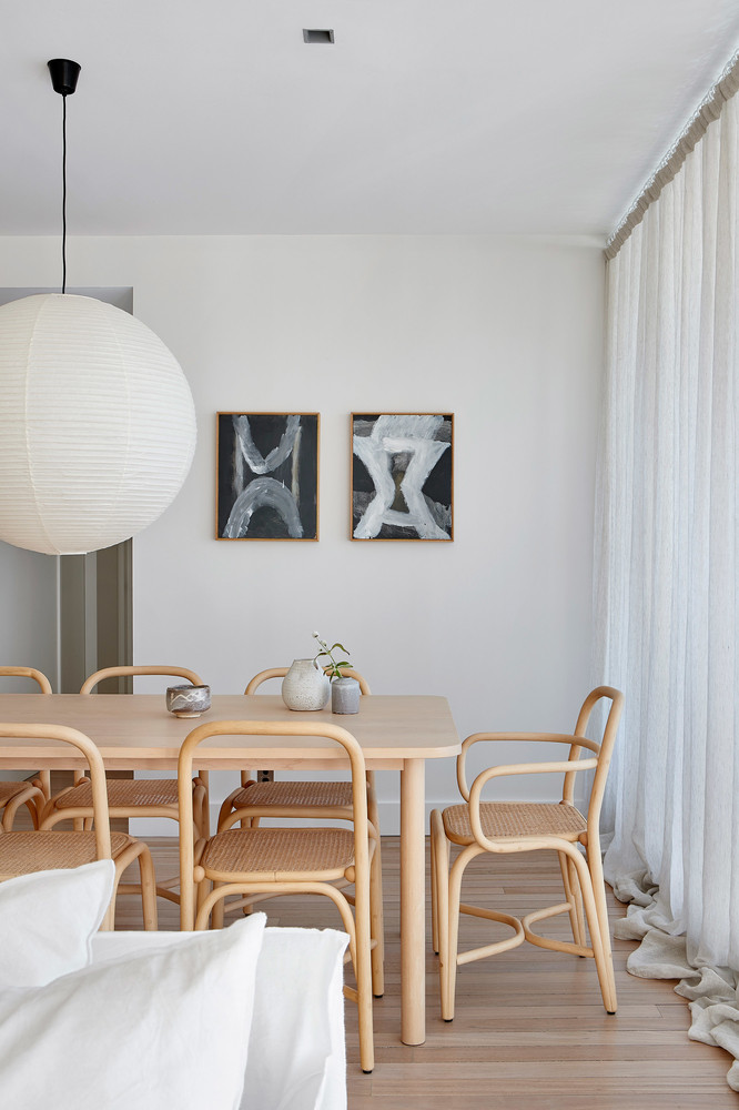 餐桌顶上的白色灯具来自于日裔美籍顶级设计大师野口勇的名作。餐桌和餐椅分别来自于两大家具品牌 Mr and Mrs White 和 KE-ZU。