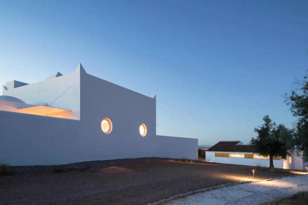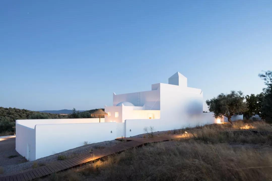 到了晚上,黄色的灯光点亮建筑与周边的小道路,让纯白的建筑在夜幕之下显得尤为优雅和温暖。